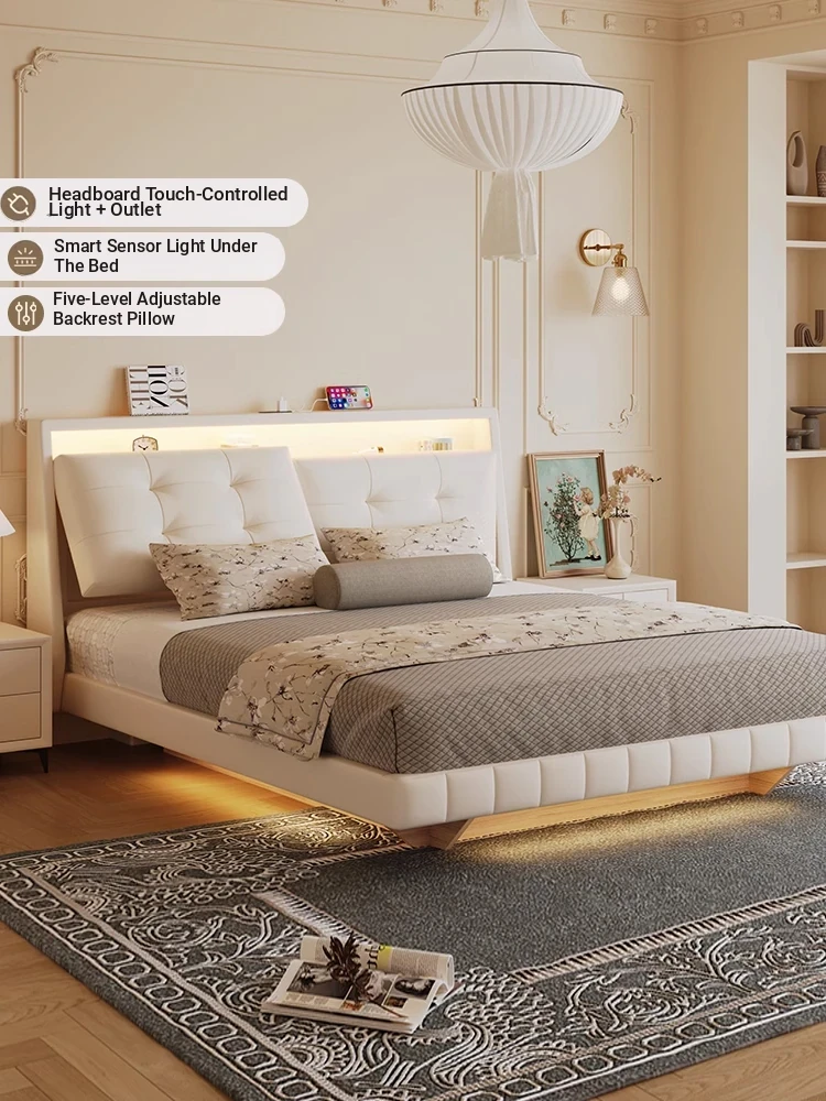 Italian Minimalist Cream Master Bedroom Genuine Leather Bed - Modern Simplicity with Top-Grain Leather, Floating Design & Multifunctional Storage