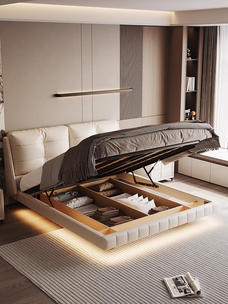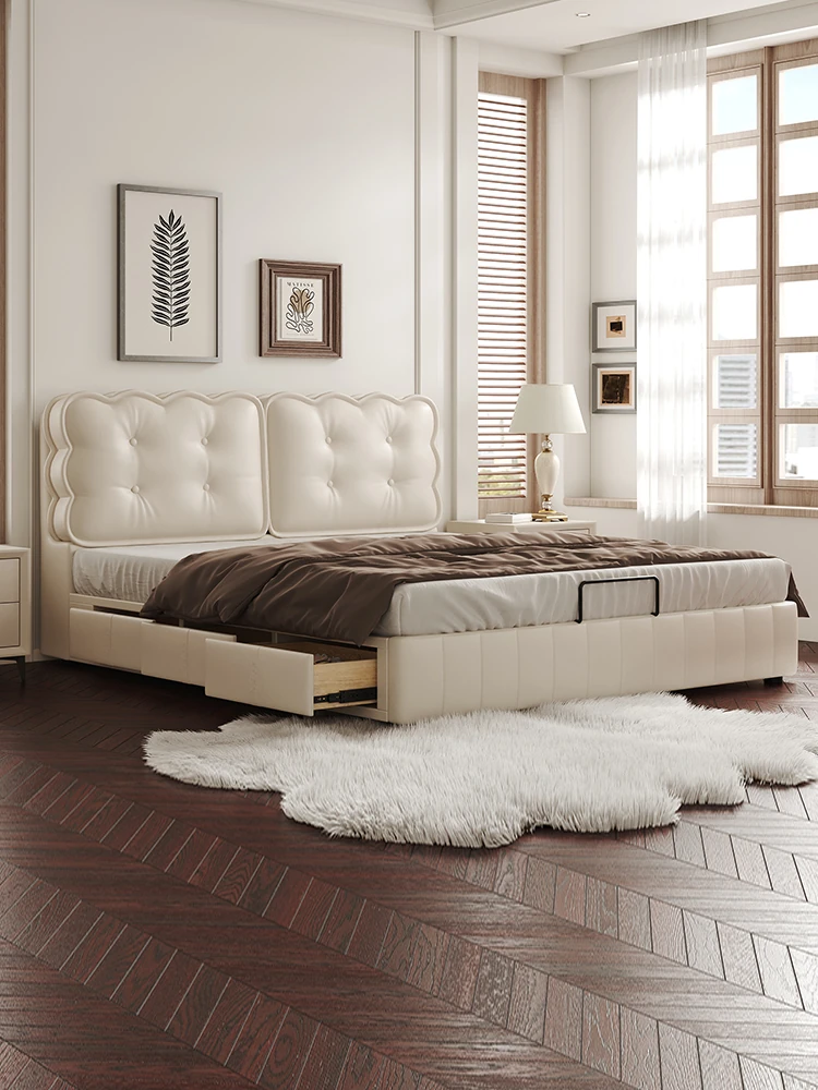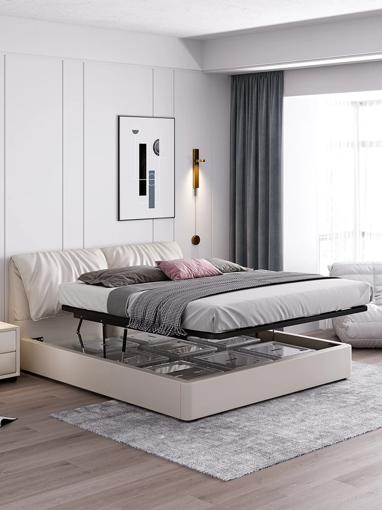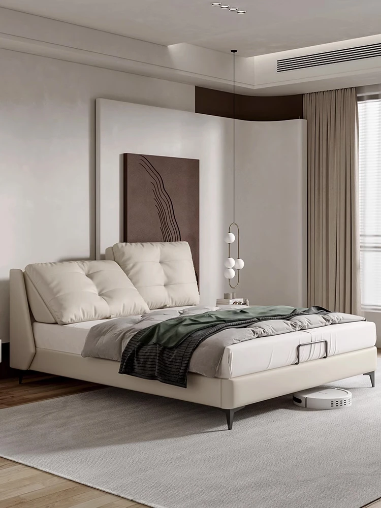 Luxurious Italian Leather Bed: Cream-Colored, Adjustable Cushioned Headrest, High-Capacity Storage, Modern Minimalist Design for the Master Bedroom.