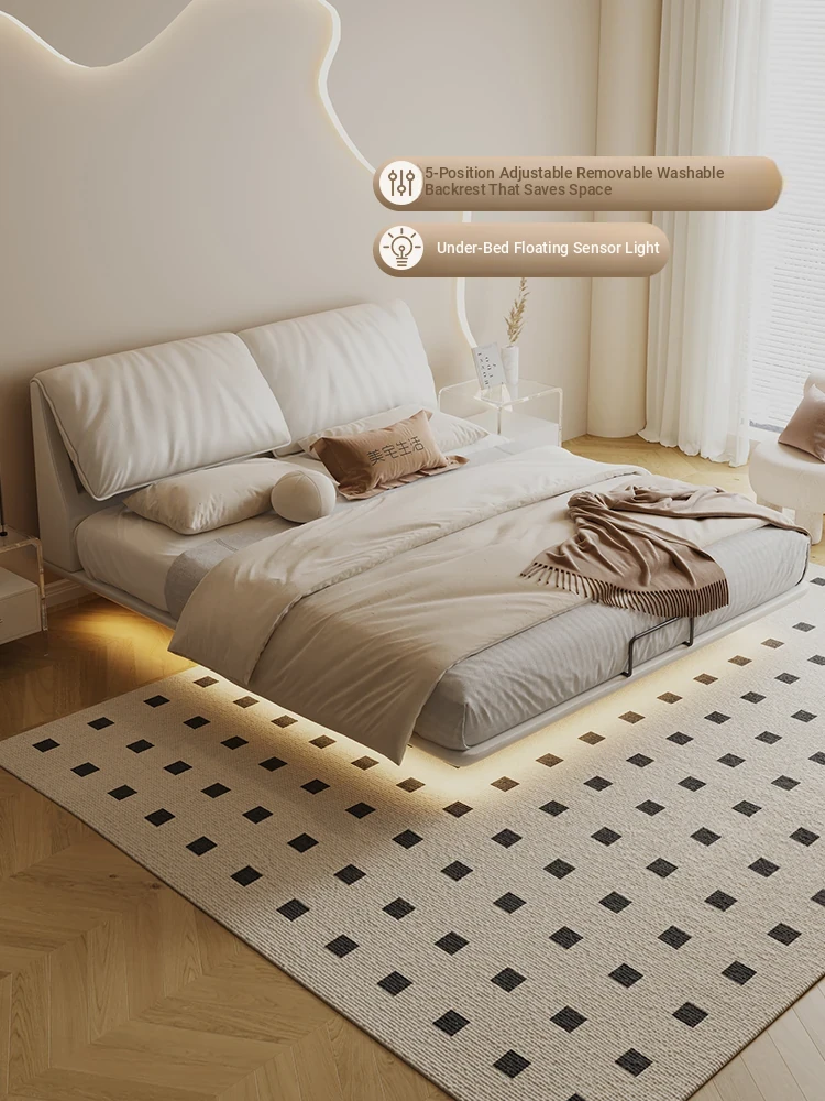 Contemporary Minimalist Luxurious Floating Storage Bed - Master Bedroom Leather Double Bed with Ultra-Simple Cream Aesthetic and Unique Elephant Ear Cushioned Headboard