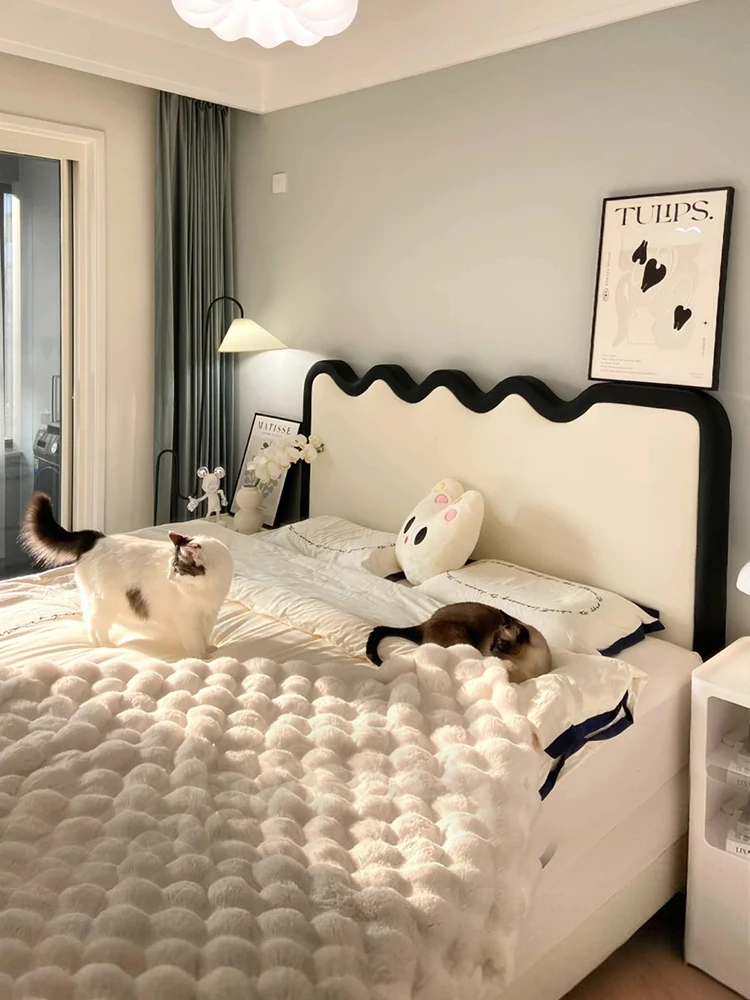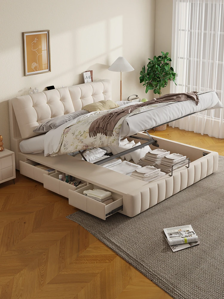 Trendy French-Style Creamy Wave Leather Bed - Chic 1.8m Storage Bed for Small Spaces and Guest Rooms