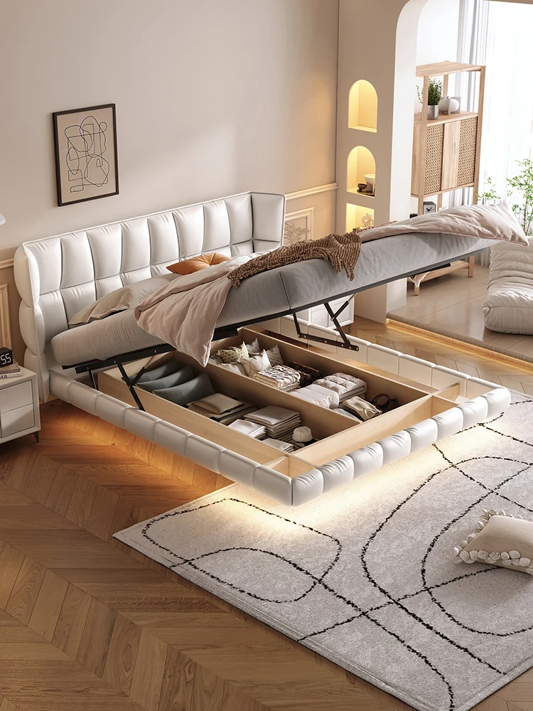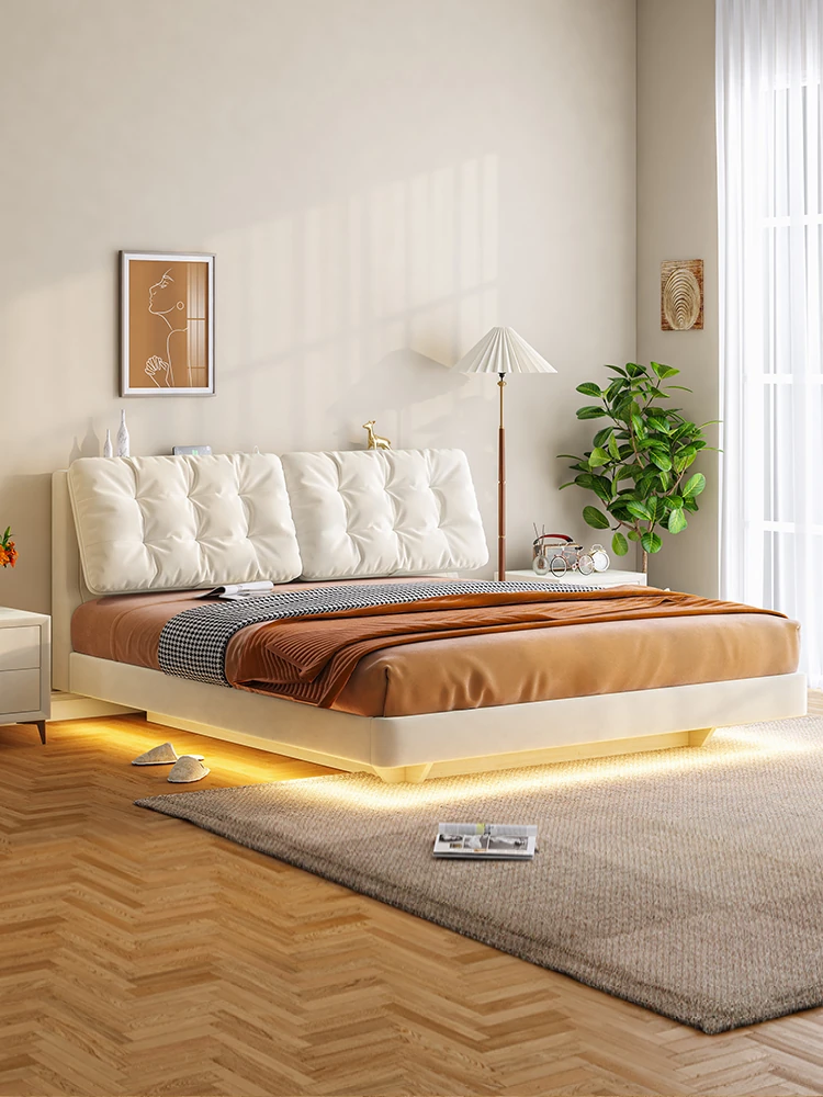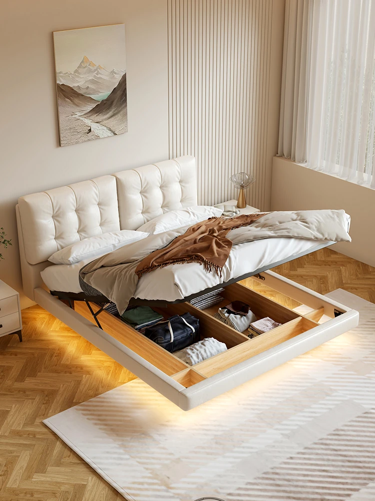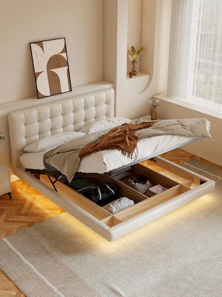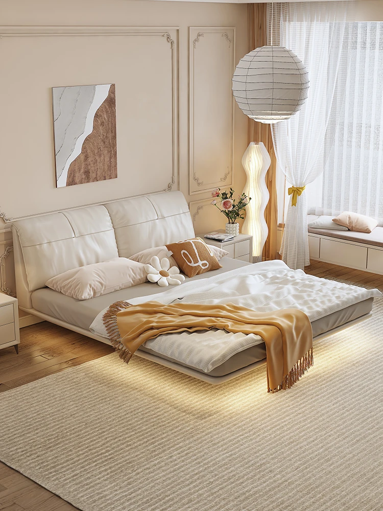 クリーム風合いの本革ベッド、北欧ミニマルデザインのモダン軽奢寝室用、コンパクトな小部屋に最適な浮遊型ダブルベッド、収納付きで機能性も抜群!