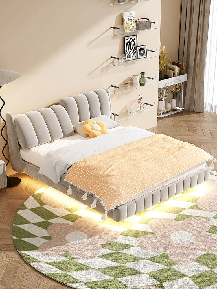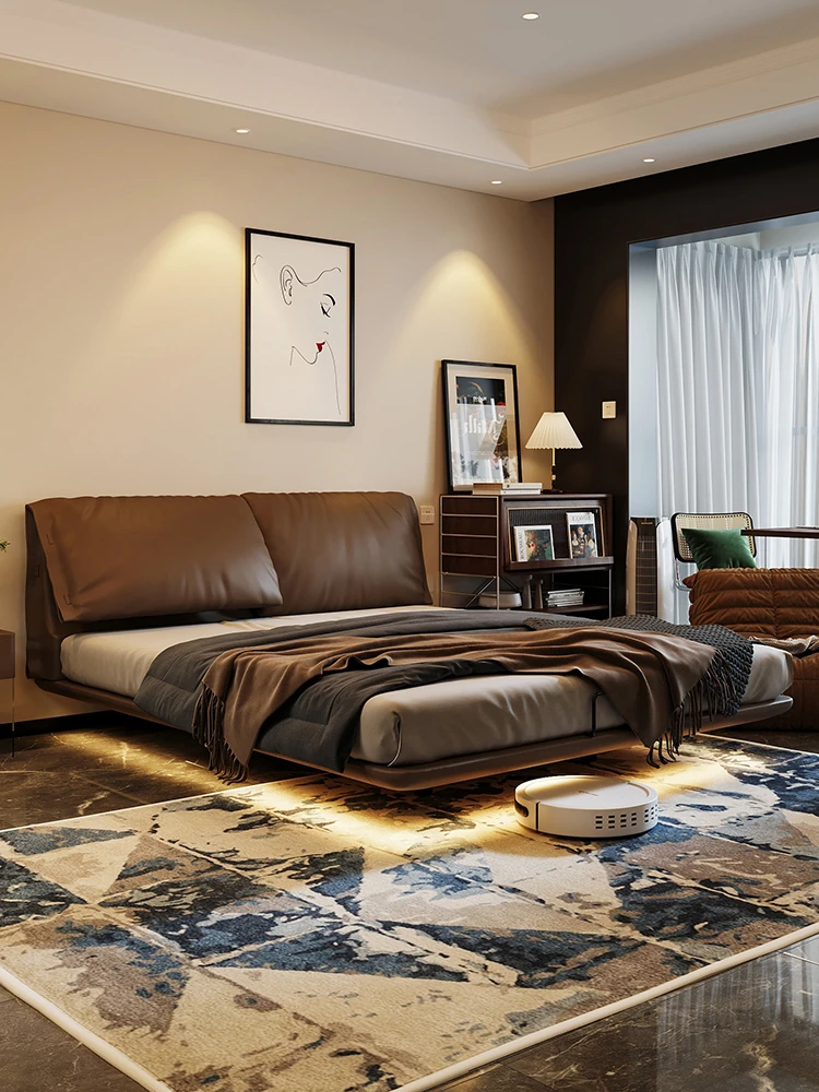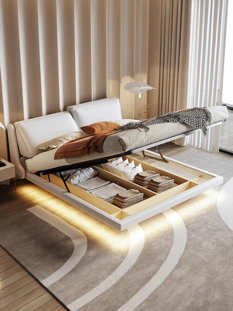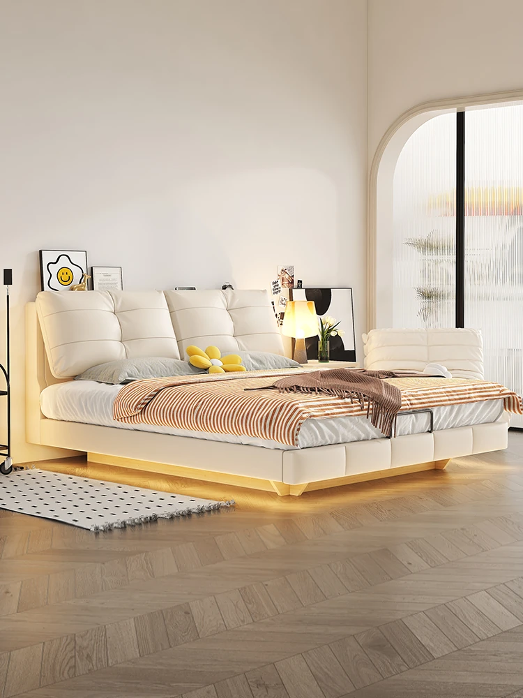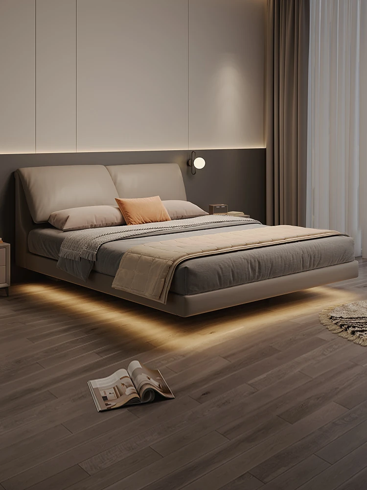 クリーム風合いの本革ベッド、北欧ミニマルデザインのモダン軽奢寝室用、コンパクトな小部屋に最適な浮遊型ダブルベッド、収納付きで機能性も抜群!