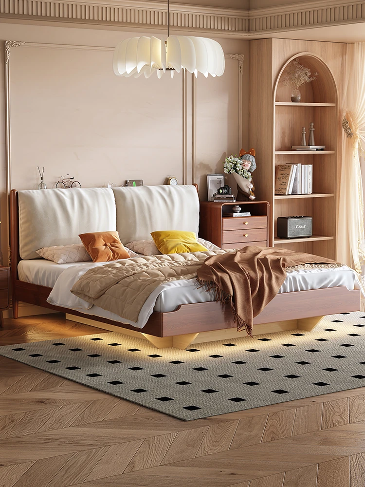 北欧風ヴィンテージスタイルの天然木ベッド|クリーミーカラーと先進的な布製ソフトバックレスト|コンパクトからモダンな主寝室に最適な2人用ベッド