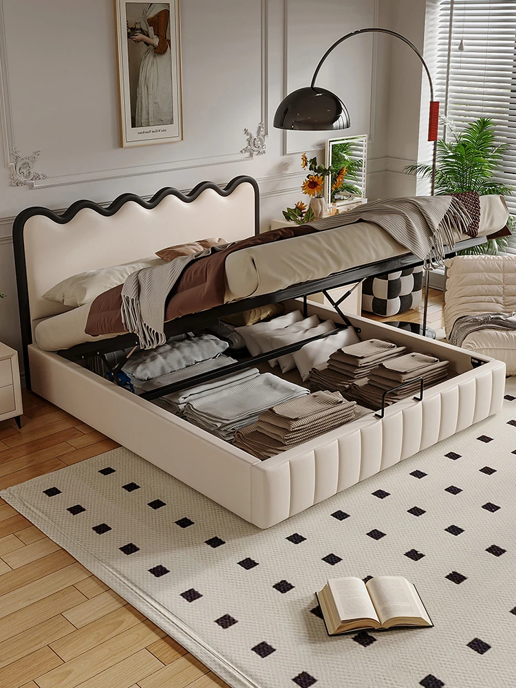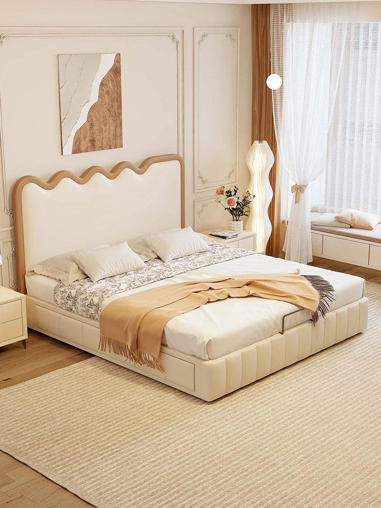 新登場!軽量かつ高級感溢れるモダンデザイン- フランス風クリームリップルウェーブ真皮収納ベッド。トレンドを先取り、寝室をスタイリッシュに飾るダブルベッド!