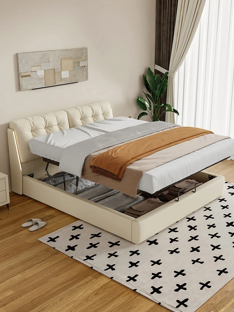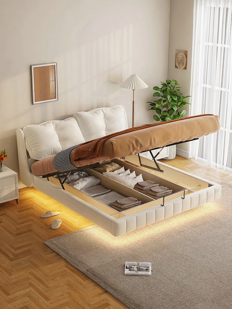 2025年最新モデル!雲のような浮遊感を楽しめるベッド - モダンでシンプルなクリームスタイル、小さなお部屋にもぴったりな収納付き本革ベッド