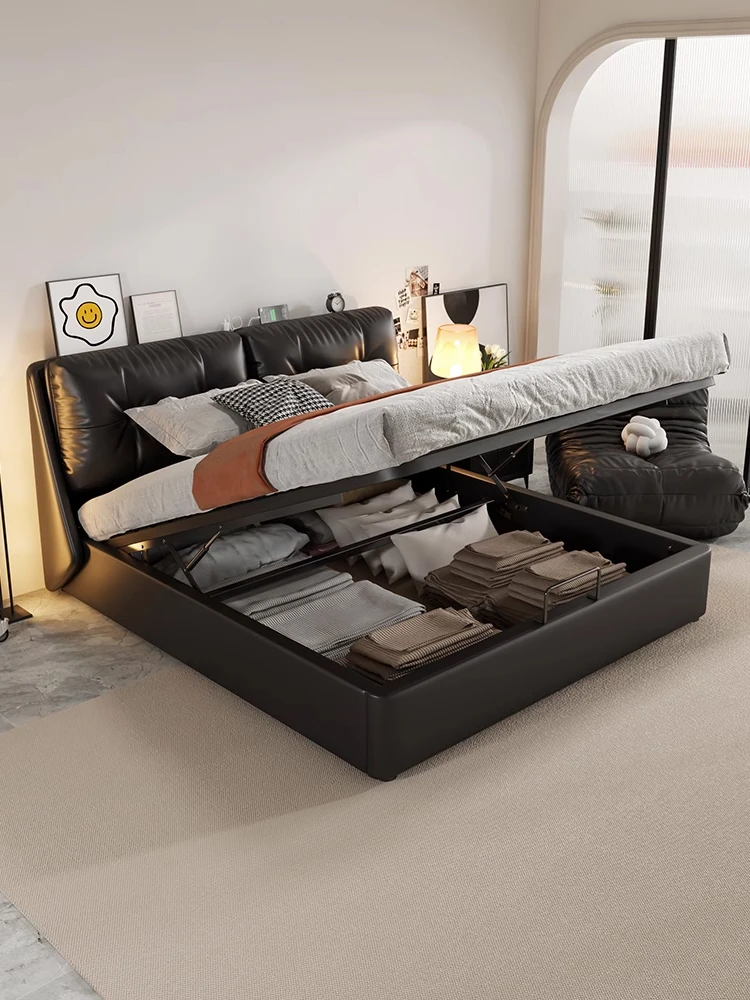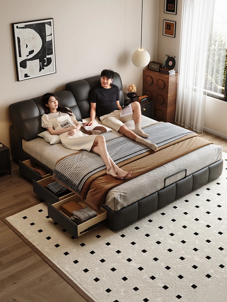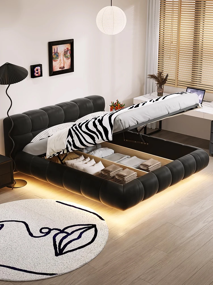 インフルエンサー推奨!多機能ストレージ付き、邪魔にならないダブルベッド。主寝室に最適な本革製、モダンシンプルなクラウドスタイルのブラックソフトパッキングベッド。
