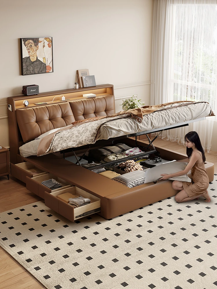 クラウド本革ベッド - 高級感溢れる主寝室用ダブルベッド!多機能収納付きのレトロデザインで、洗練されたコーヒーブラウンが魅力。優雅な眠りを提供する究極のアイテムです!