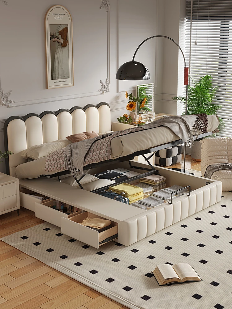 イタリアンミニマリスト風クリームパフ高箱収納ベッド|現代的なシンプルさを追求した主寝室用ダブルベッド|ラグジュアリーな本革仕立ての雲のような快適さを提供します!