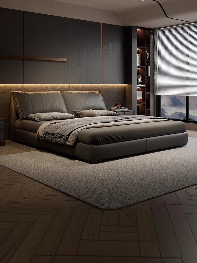ワッフルベッド クラウド – イタリアンミニマリズム真皮ベッド、洗練されたデザインで主寝室を高級感あふれる空間に。収納機能付きのシンプルな黒いダブルベッド、薄型のヘッドボードでスタイリッシュな寝室を実現!