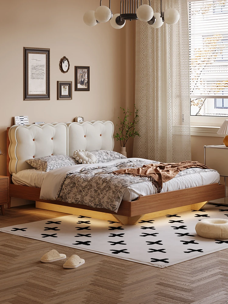 素言家具のレトロ波形デザインベッド|高背・クリーム色のモダンシンプル収納ダブルマスター寝室用|お洒落で快適な寝空間を演出!