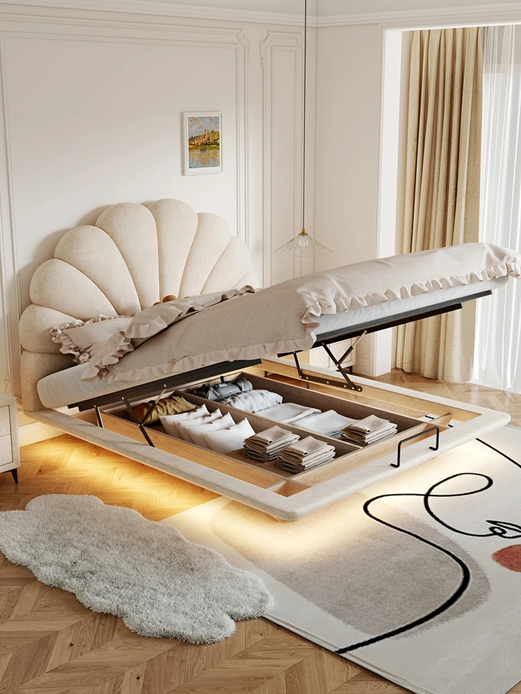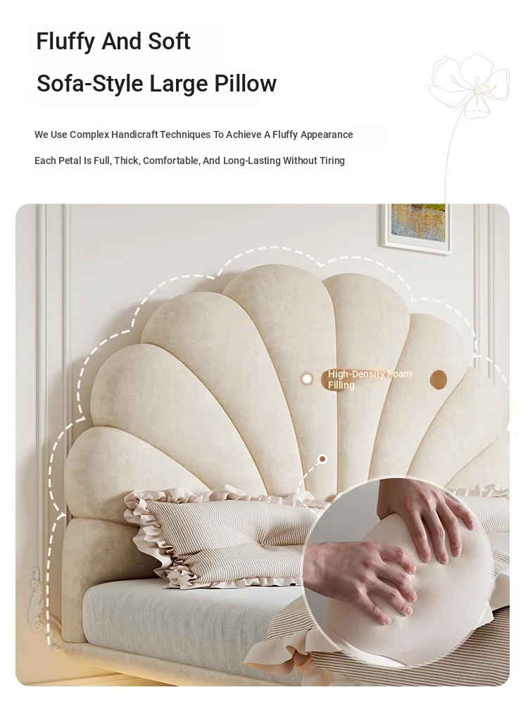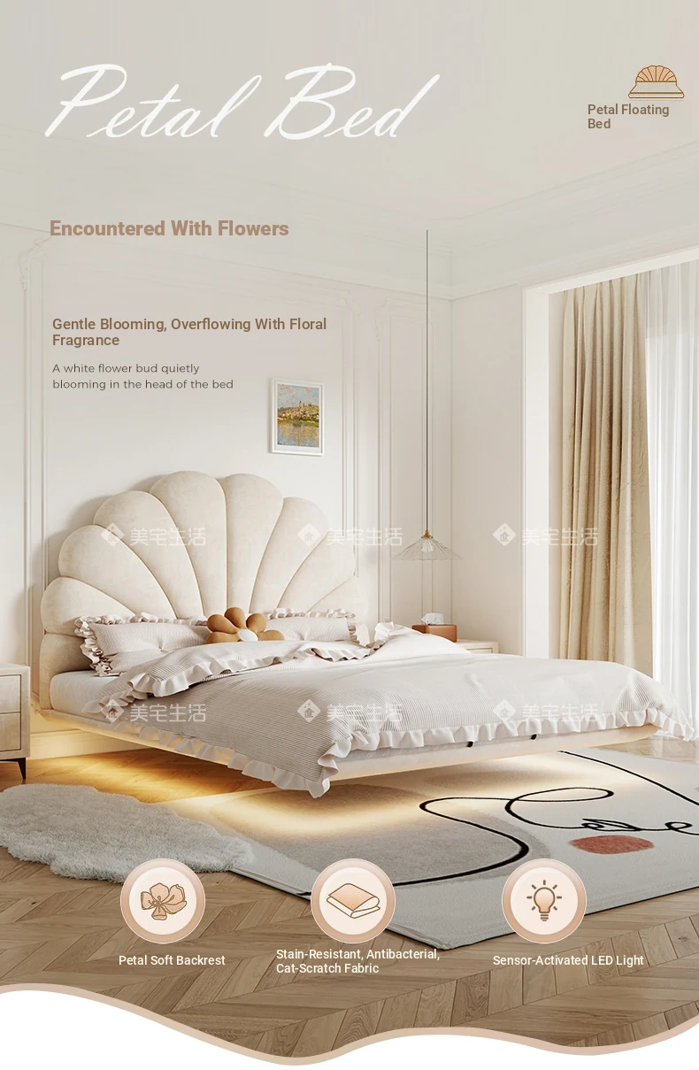 Floating Petal Princess Bed - Cat Scratch Fabric, Creamy White, Space-Saving Round Upholstered Double Bed with Storage for Small Secondary Bedrooms