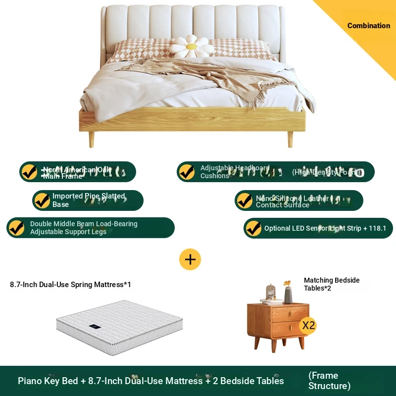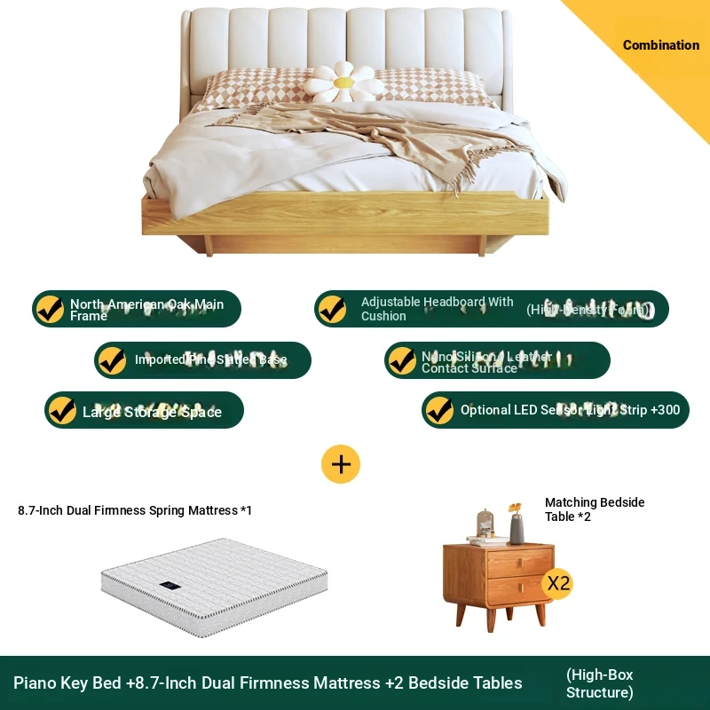Piano key bed +8.66in soft and hard mattress +2 bedside tables (high box structure)