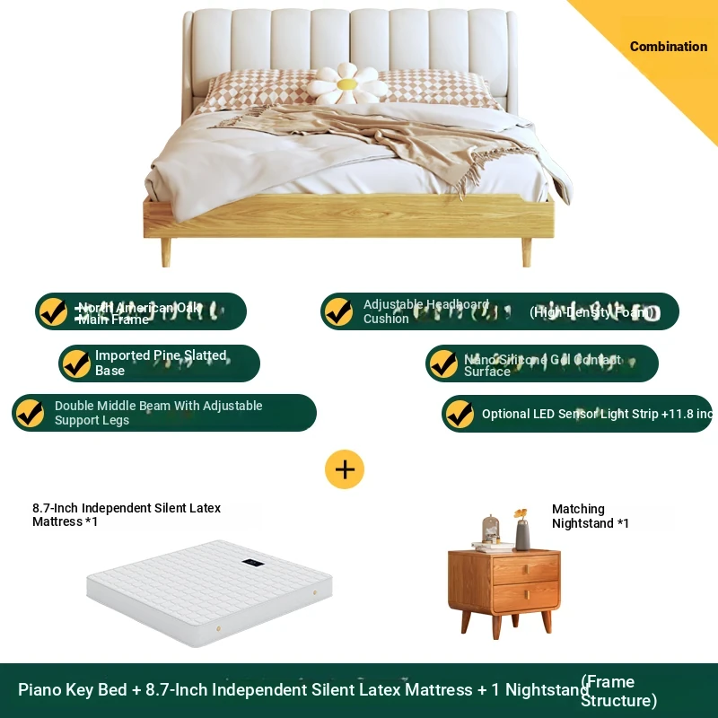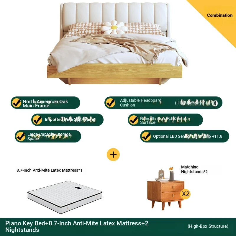 Piano key bed +8.66in independent silencer latex mattress +2 bedside tables (high box structure)