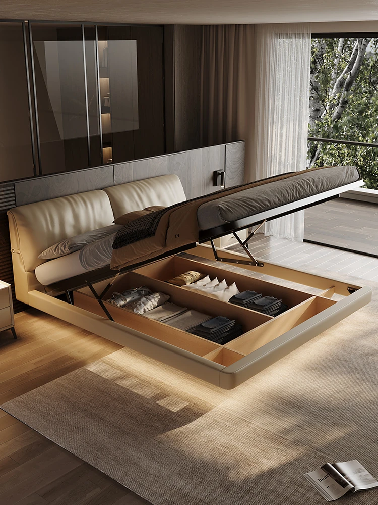 Title: Modern Sleek Design Cadli Double Leather Platform Bed with Removable Cushions and Elephant Ear Floating Headboard - Space-Saving Storage Box Included
