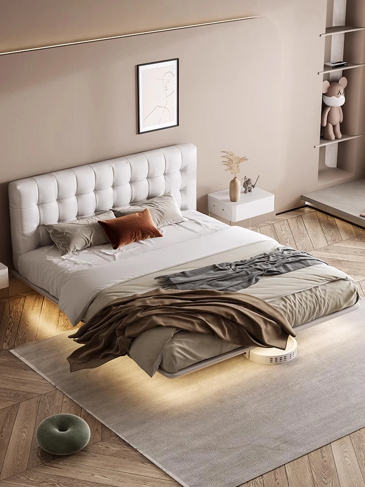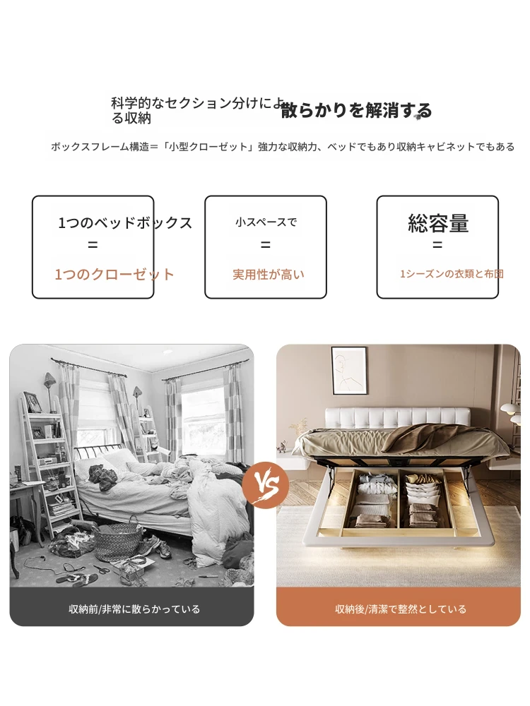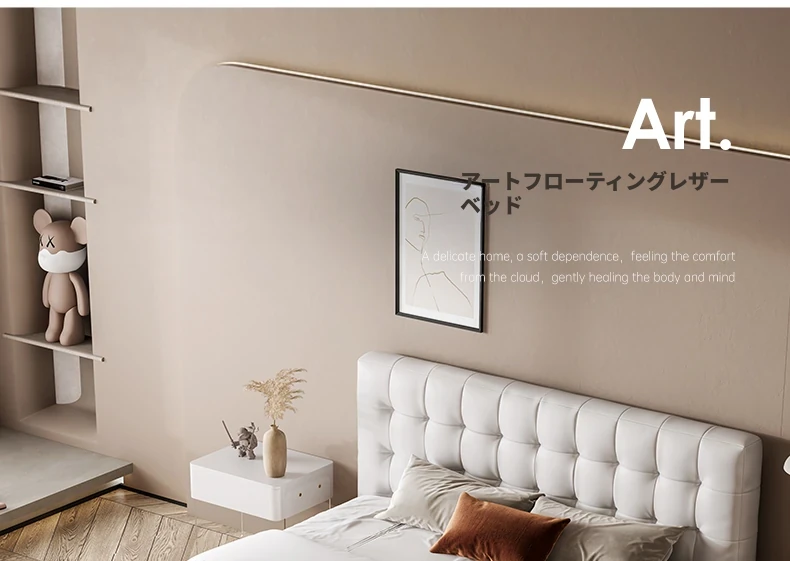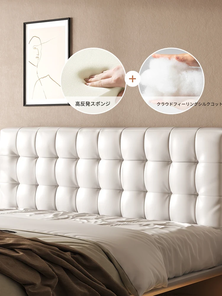 「ふんわり浮遊感!トレンディなクリーム色レザー収納ベッド - モダンでシンプルなデザイン、主寝室にぴったり足元をスッキリと魅せる高収納力・柔らかヘッドボード付き」