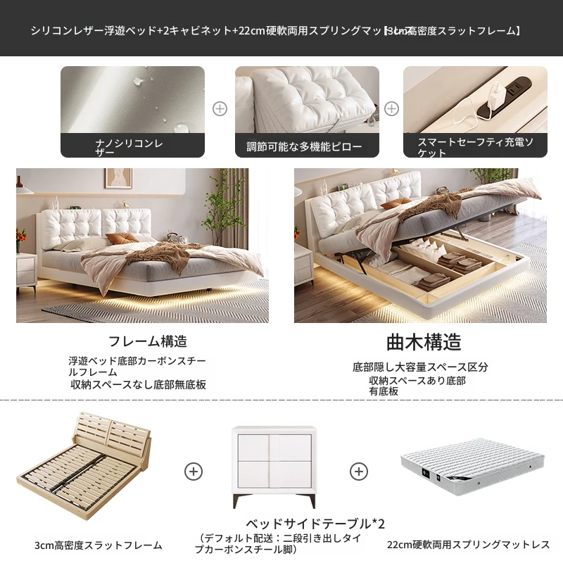 トップレザーフローティングベッド+2台キャビネット+22cm両面ハードソフトスプリングマットレス