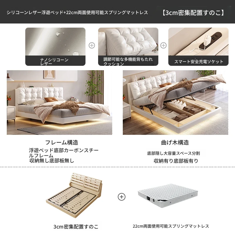 シリコーンレザー浮床+1台キャビネット+22cm両面ハードソフトスプリングマットレス【3cm高密度スラットフレーム】