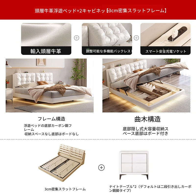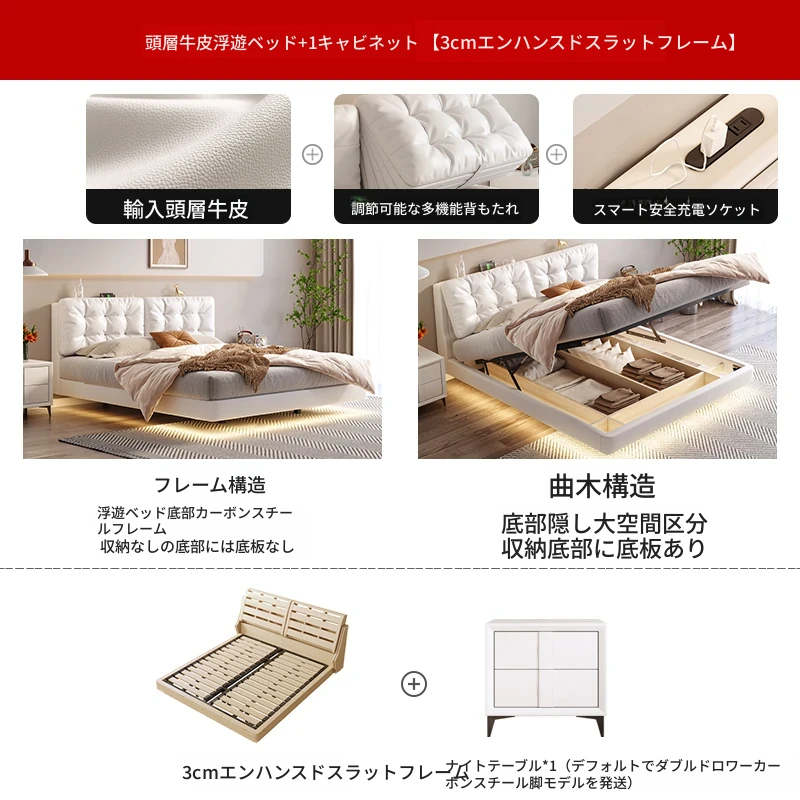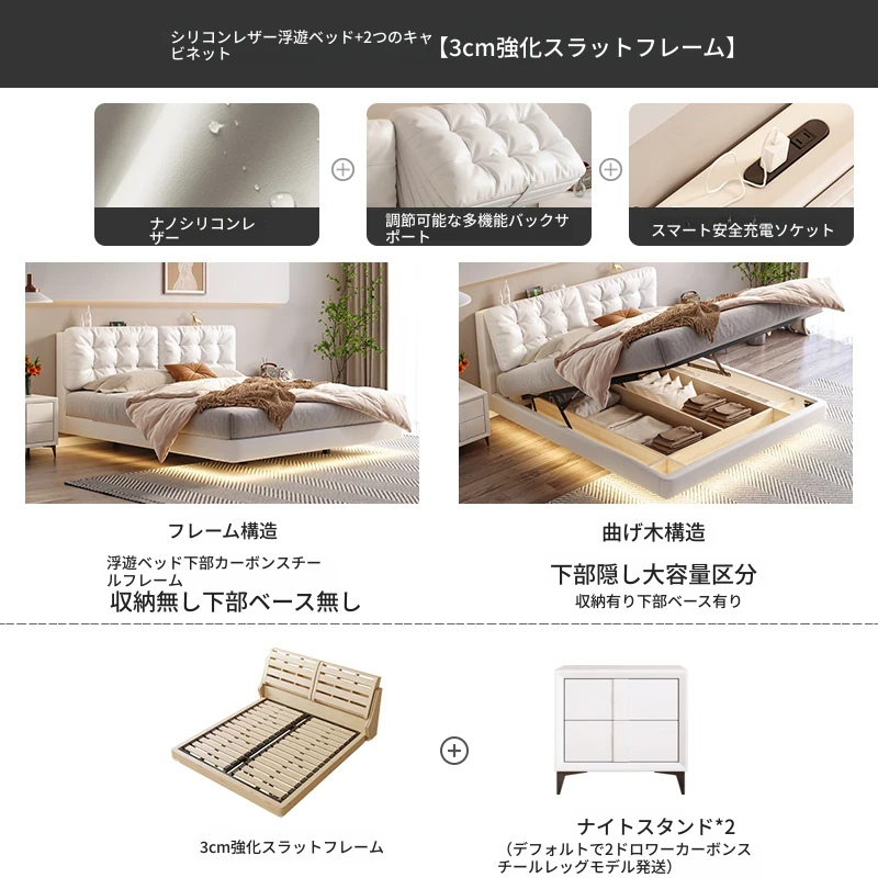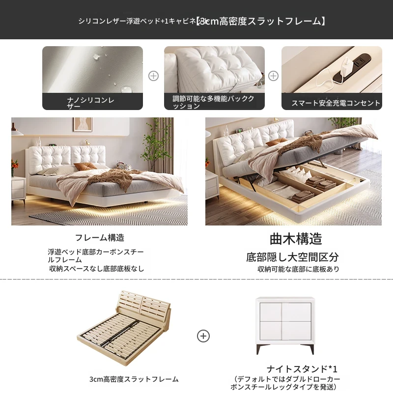 トップレザーフローティングベッド+1台キャビネット【3cm高密度スラットフレーム】