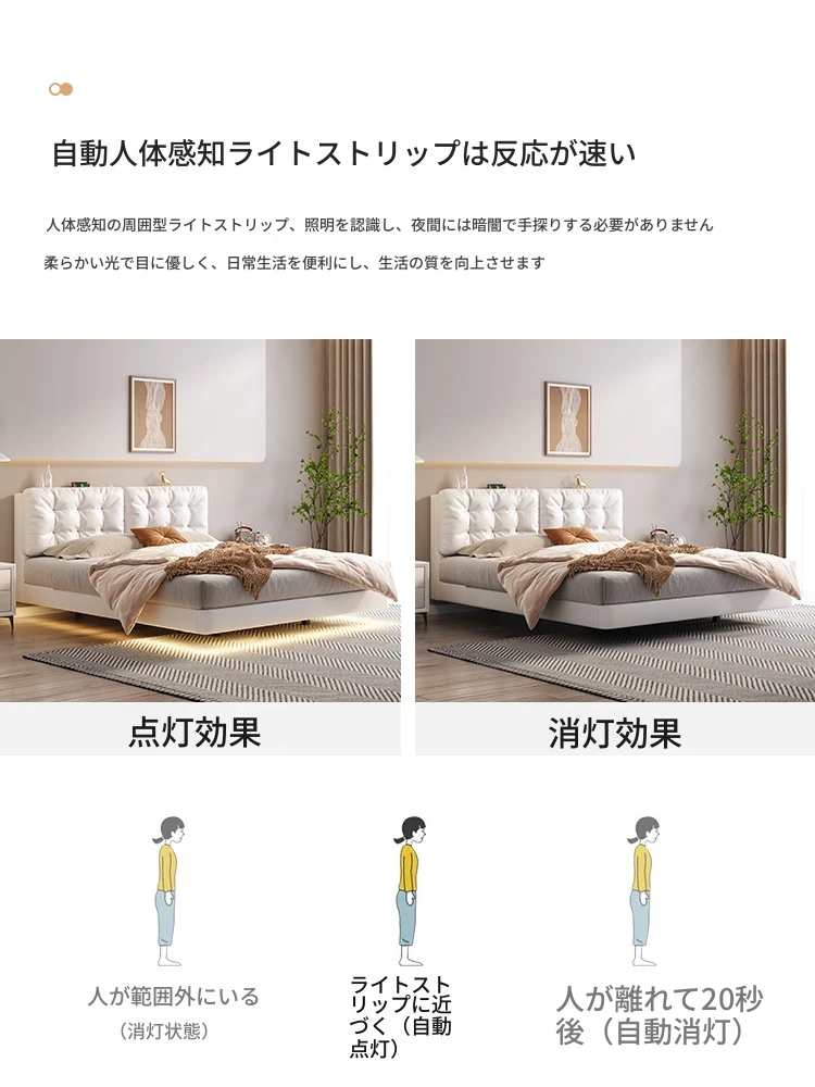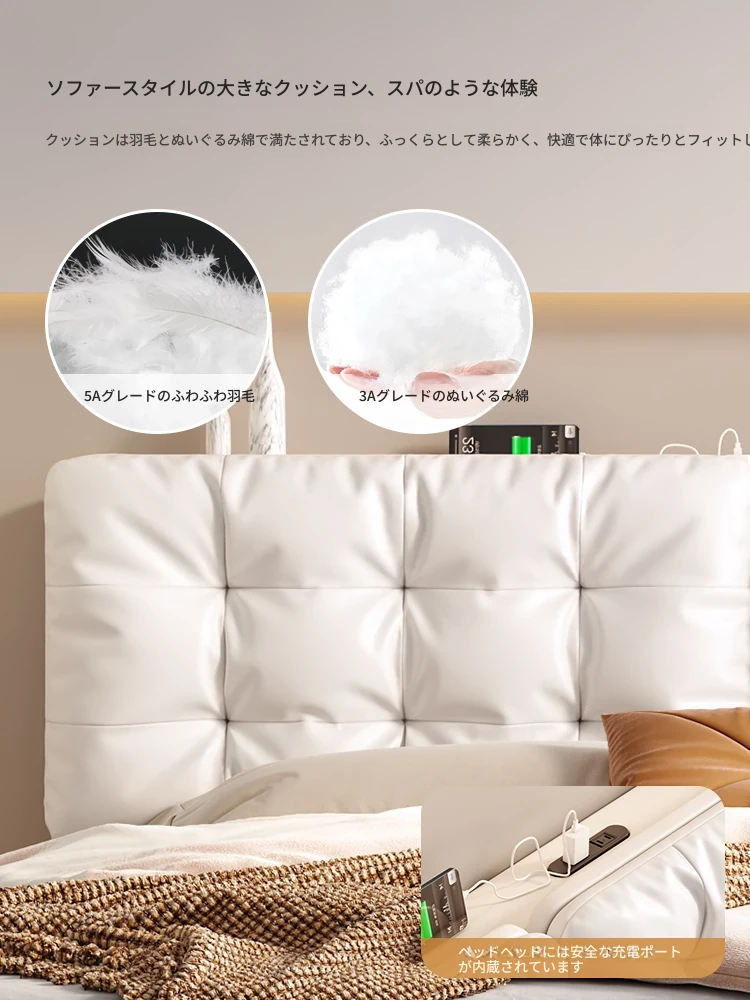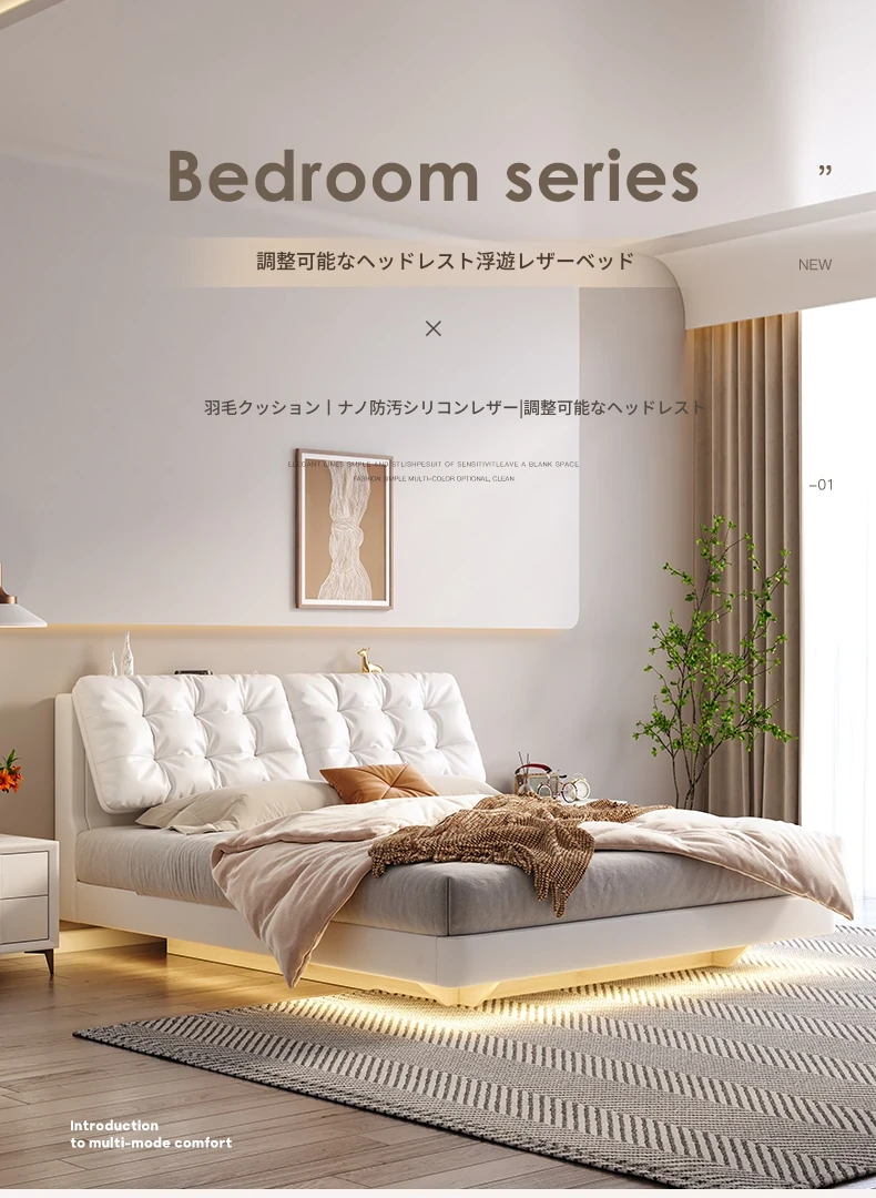 【快眠をサポート】浮遊感覚レザーベッド・収納付き!主寝室にぴったりのモダンシンプルデザイン。イタリアンミニマリズムが息づくふわふわクラウドダブルレザーベッド(2m x 2.2m)。