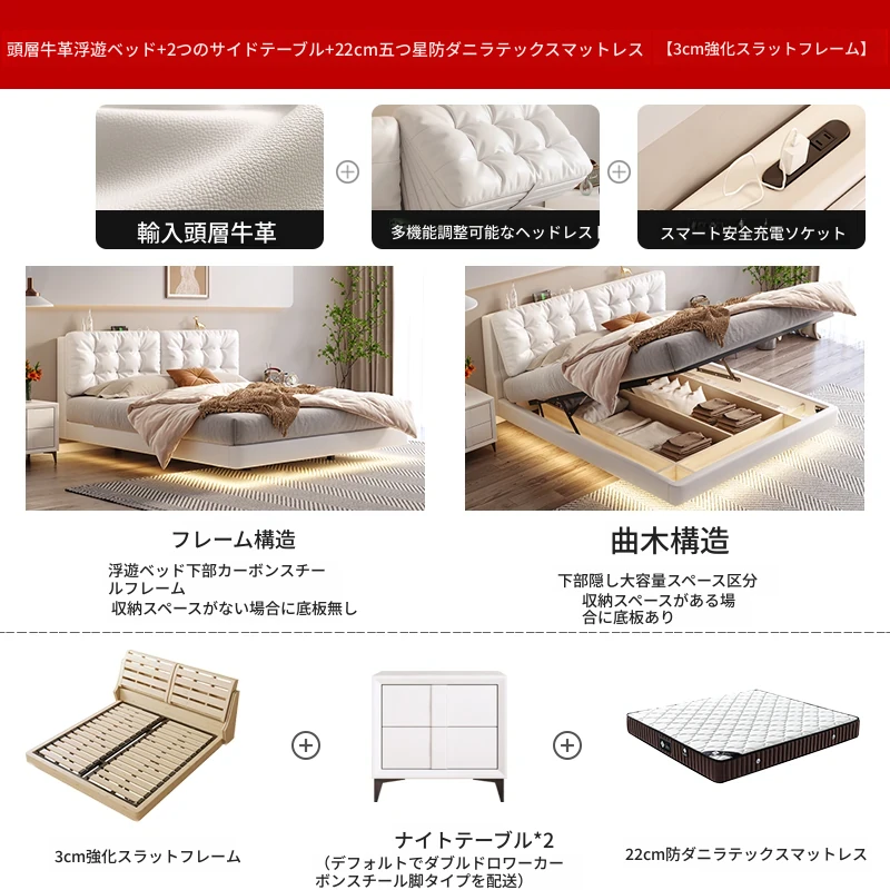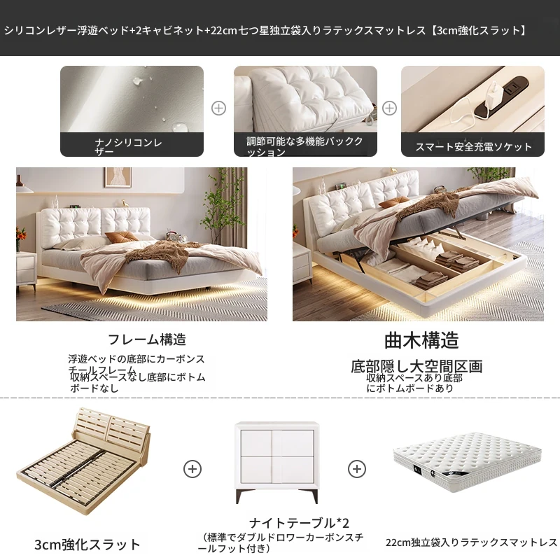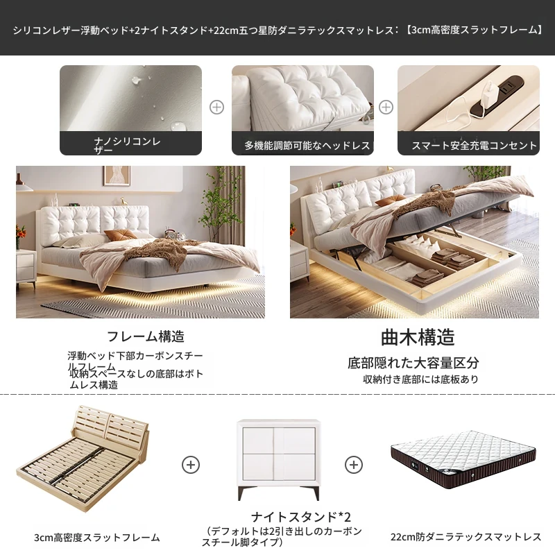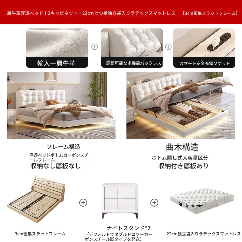 トップレザーフローティングベッド+2台キャビネット+22cm五星抗ダニラテックスマットレス