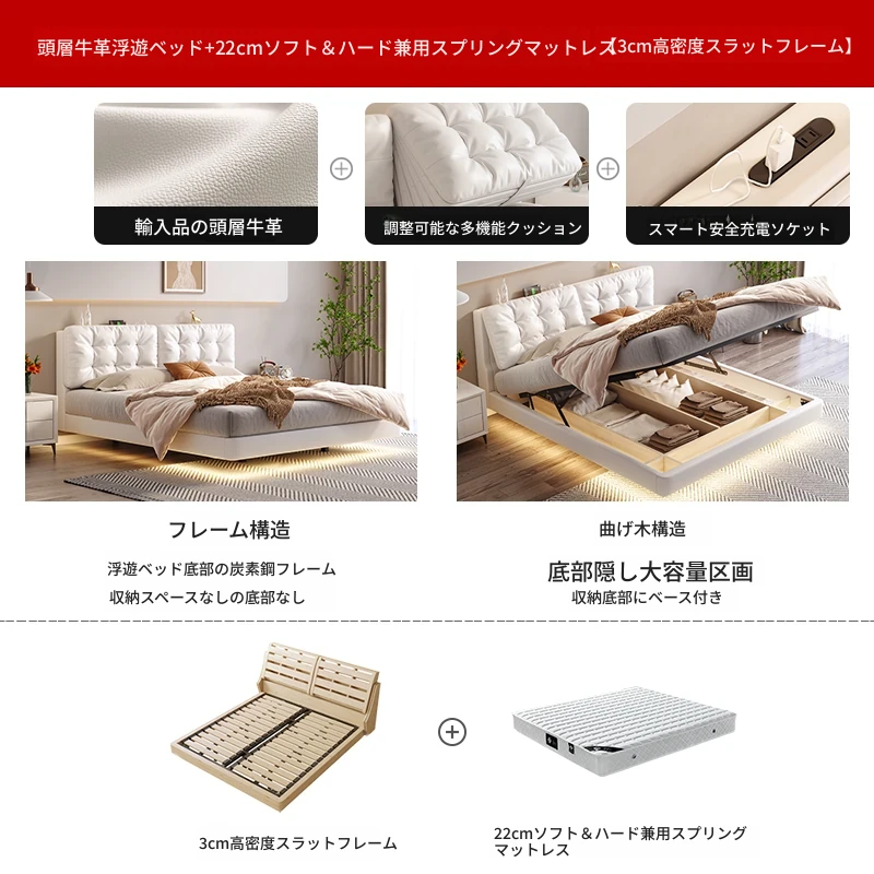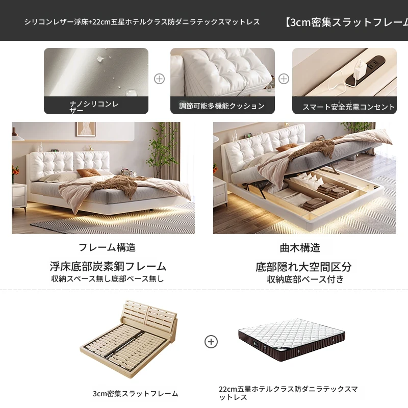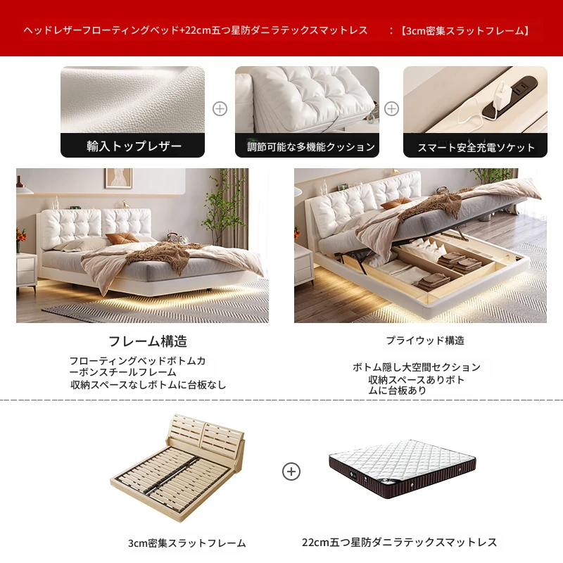 トップレザーフローティングベッド+22cm五星抗ダニラテックスマットレス