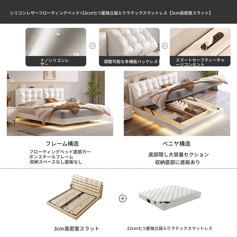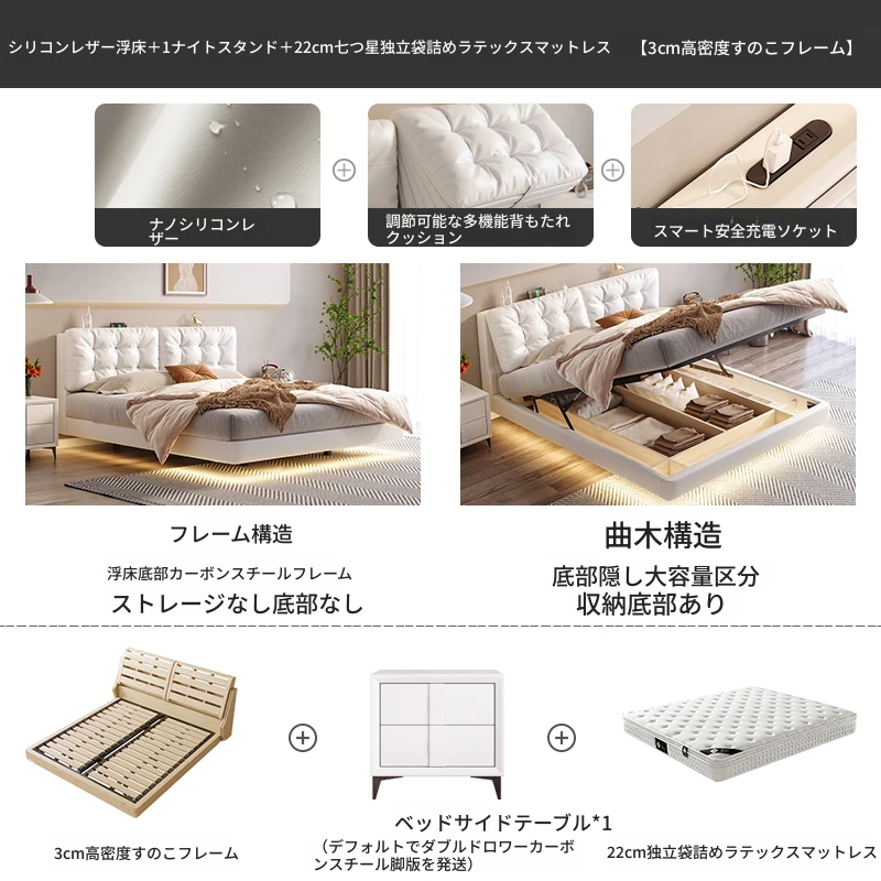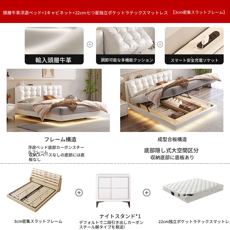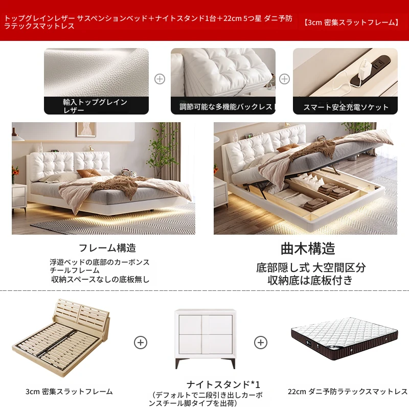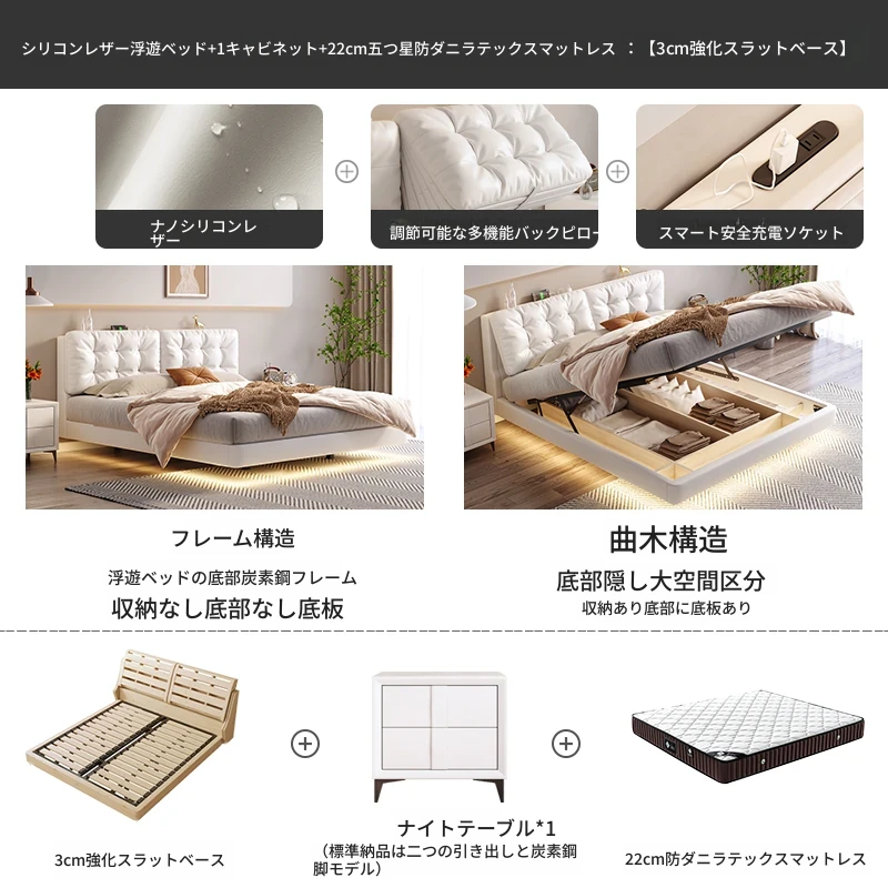 トップレザーフローティングベッド+1台キャビネット+22cm五星抗ダニラテックスマットレス