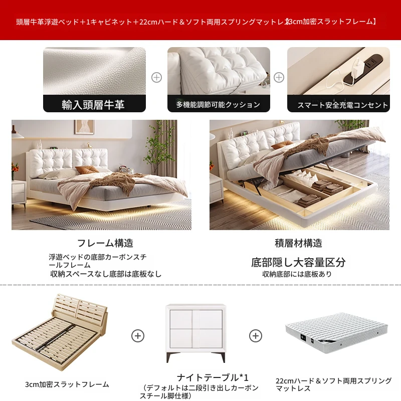 トップレザーフローティングベッド+1台キャビネット+22cm両面ハードソフトスプリングマットレス