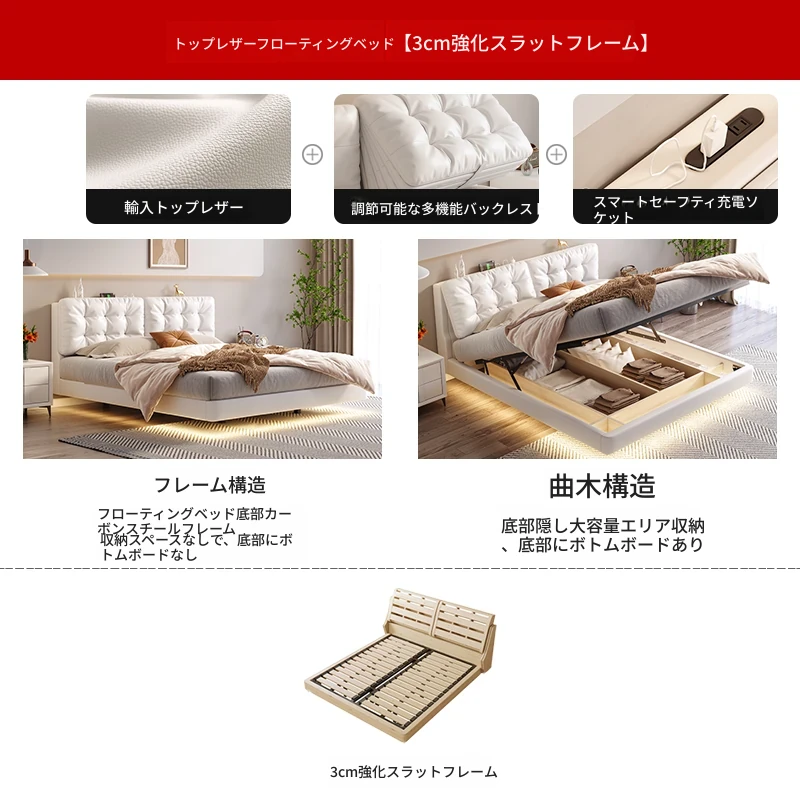 トップレザーフローティングベッド【3cm高密度スラットフレーム】