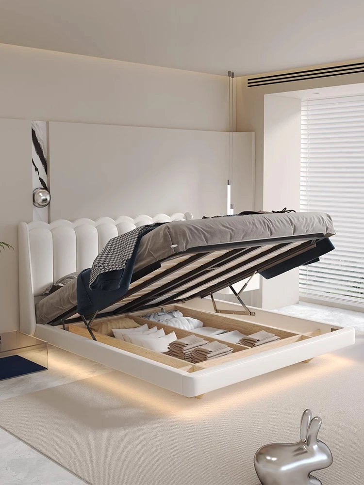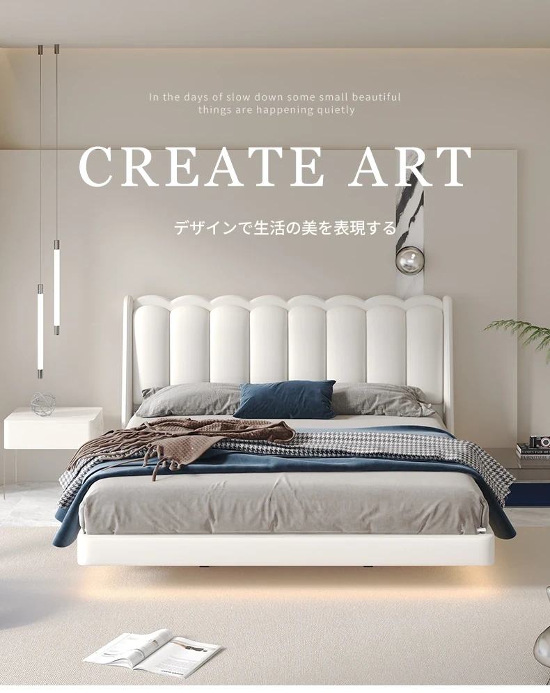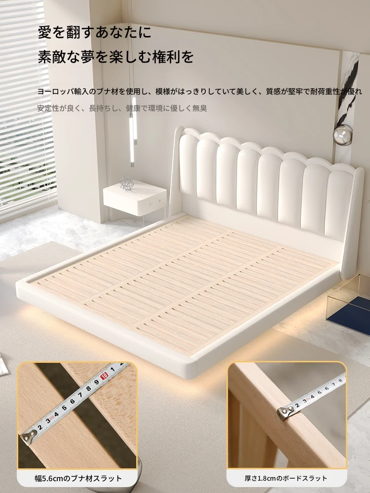 クリーム調の浮遊式ストレージベッド - 本革使用!主寝室にぴったりな1.8m・1.5mダブルサイズ、小型住宅でも快適!収納機能付きでお部屋がすっきり整理!