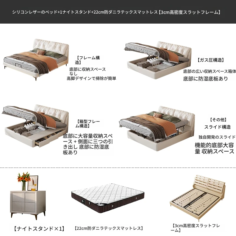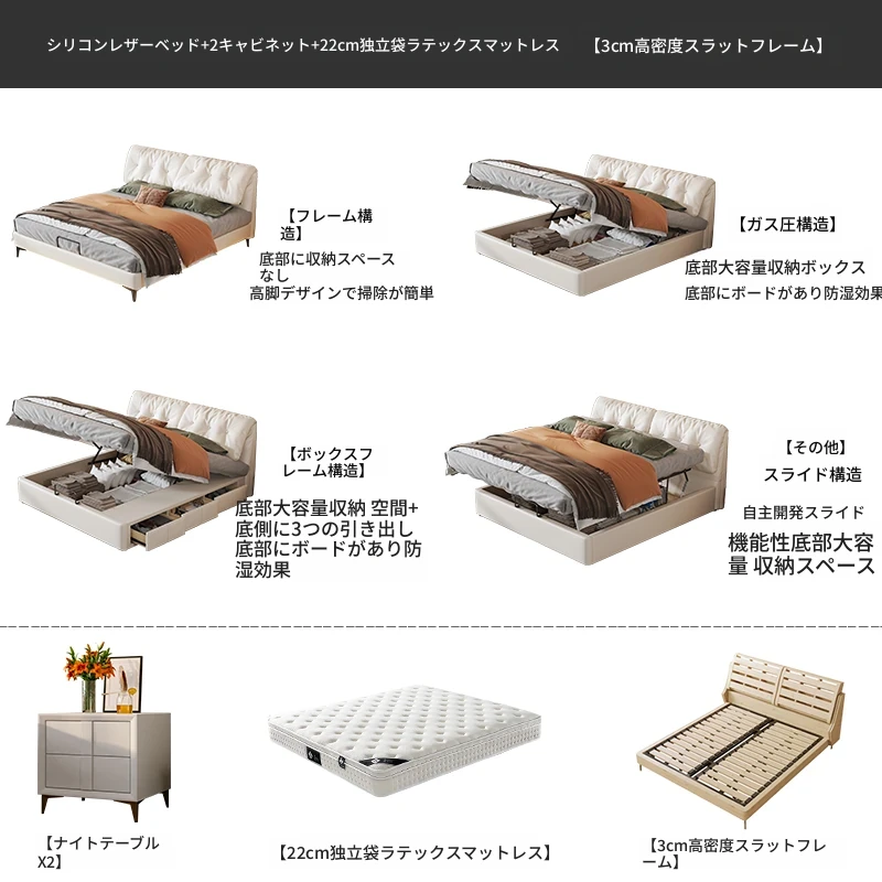 シリコンレザーベッド+1キャビネット+22cm五つ星抗ダニラテックスマットレス【3cmハイデンシティスラット】