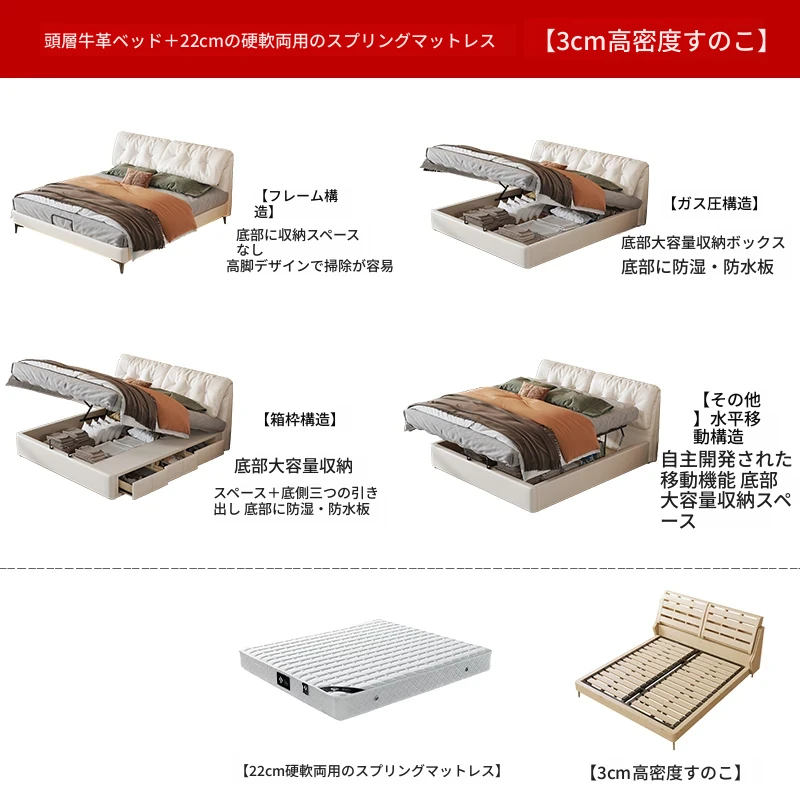 トップレザーのベッド+22cmソフトハード兼用スプリングマットレス【3cmハイデンシティスラット】