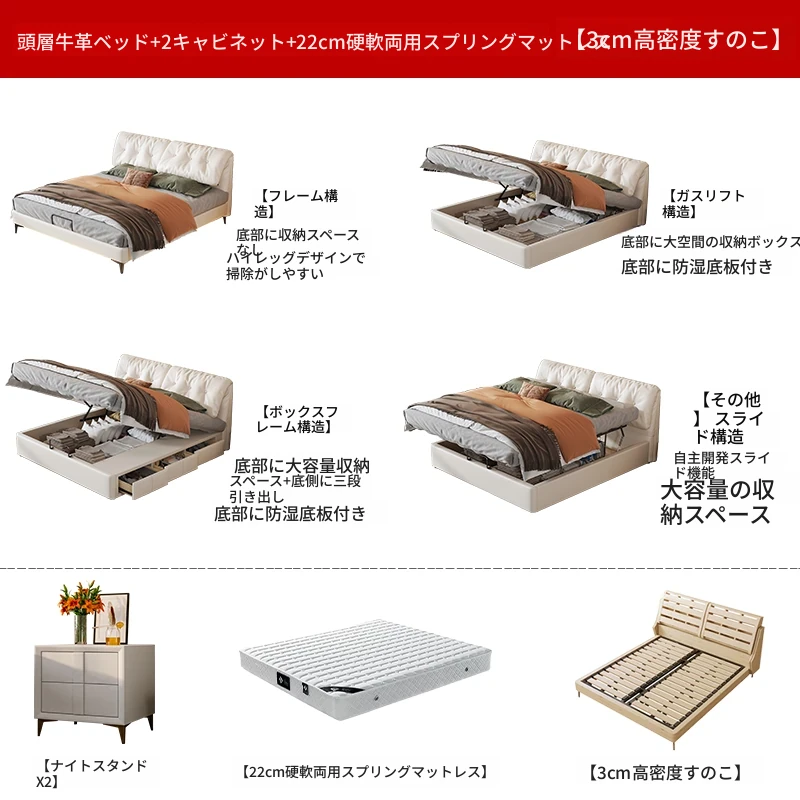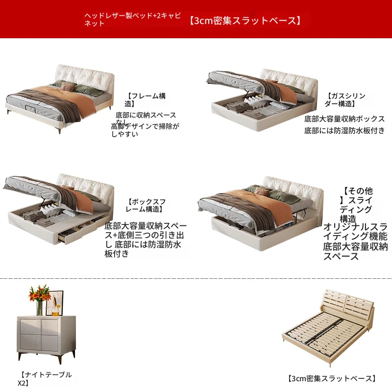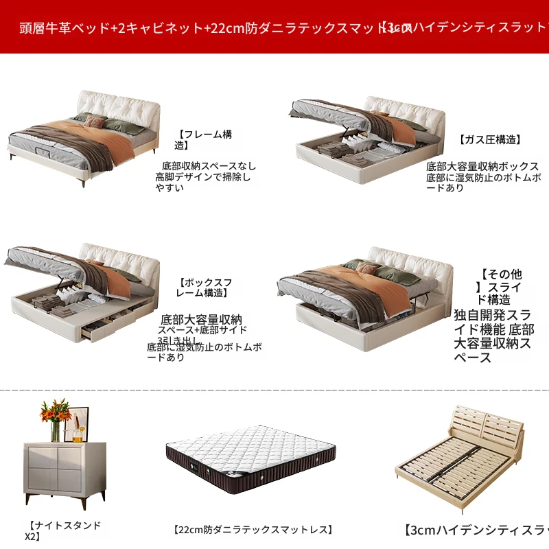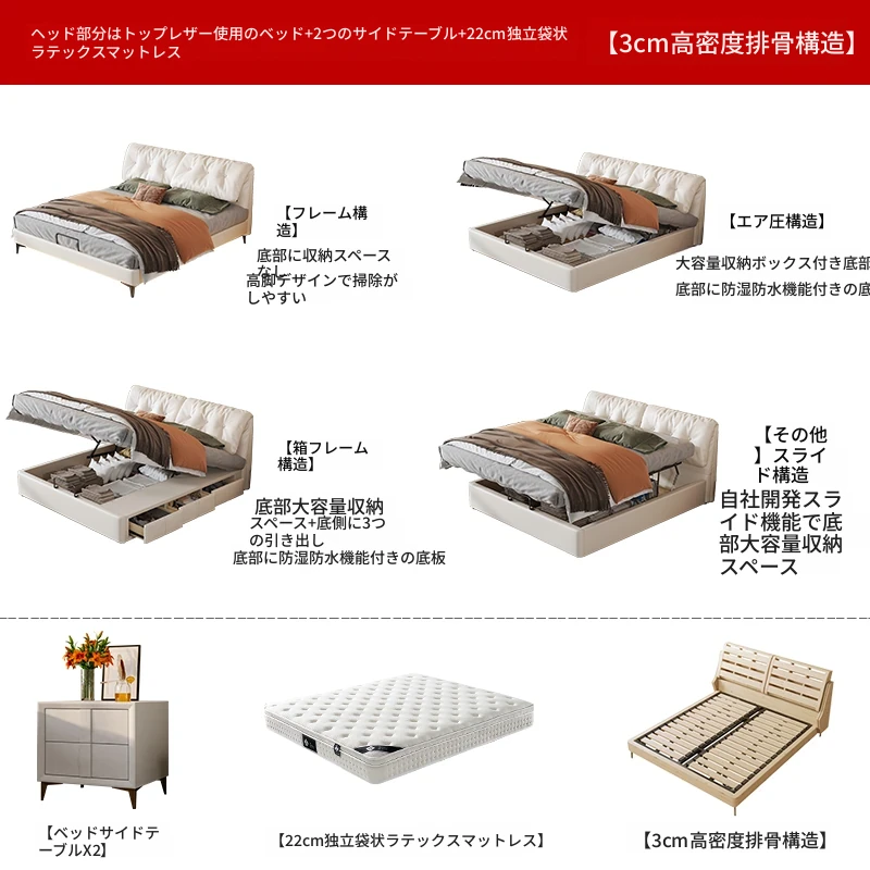 トップレザーのベッド+2キャビネット+22cm五つ星抗ダニラテックスマットレス【3cmハイデンシティスラット】