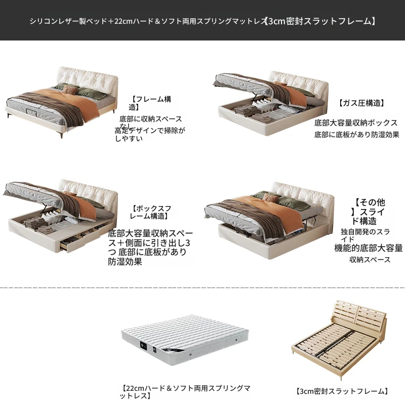 シリコンレザーベッド+22cmソフトハード兼用スプリングマットレス【3cmハイデンシティスラット】