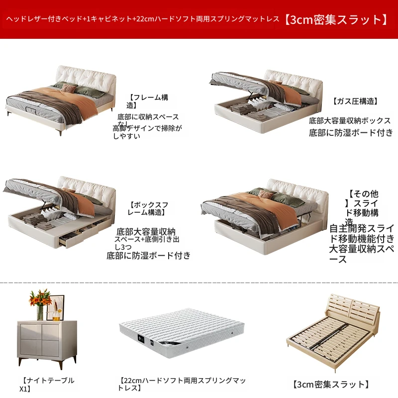 トップレザーのベッド+1キャビネット+22cmソフトハード兼用スプリングマットレス【3cmハイデンシティスラット】