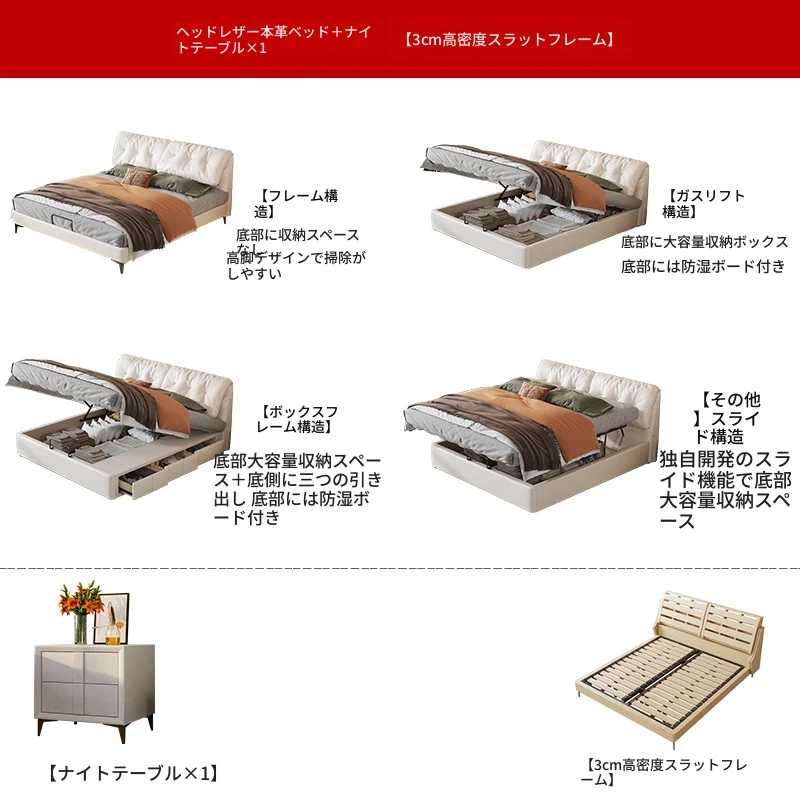 トップレザーのベッド+2キャビネット【3cmハイデンシティスラット】