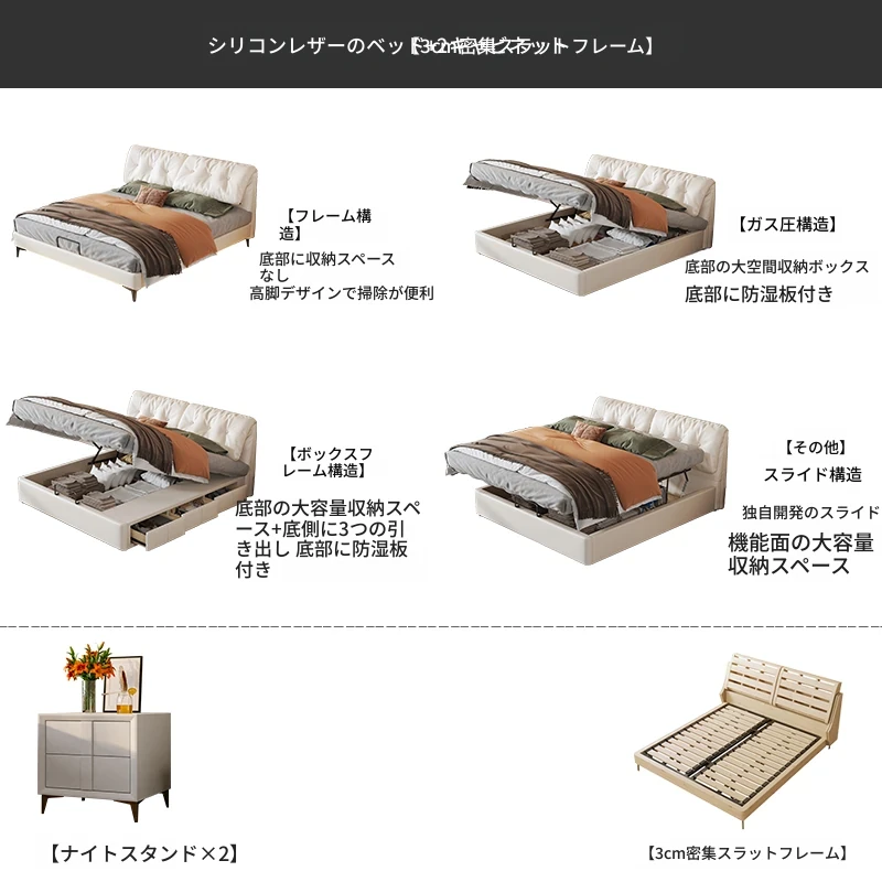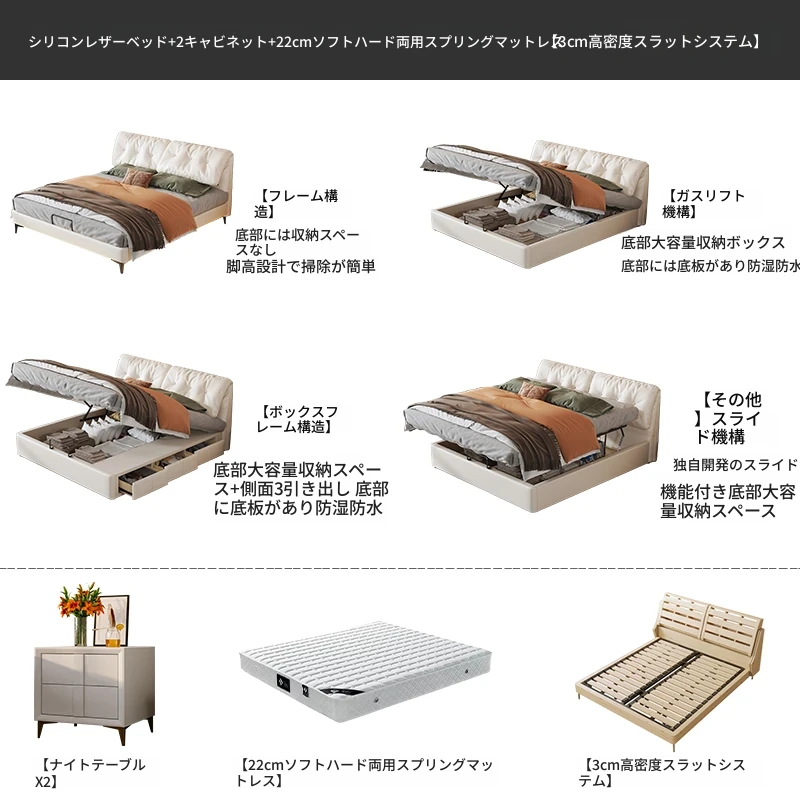 シリコンレザーベッド+2キャビネット+22cmソフトハード兼用スプリングマットレス【3cmハイデンシティスラット】