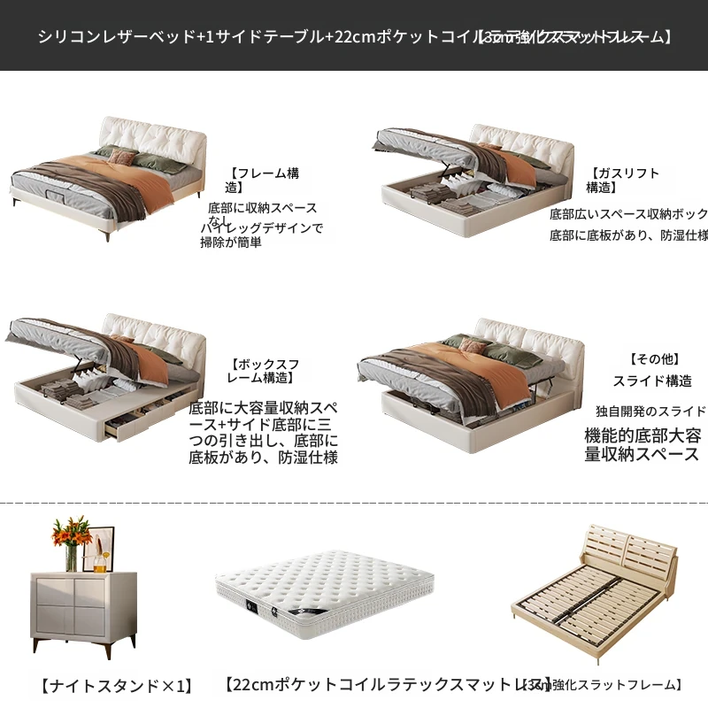 シリコンレザーベッド+2キャビネット+22cm七つ星独立バッグラテックスマットレス【3cmハイデンシティスラット】