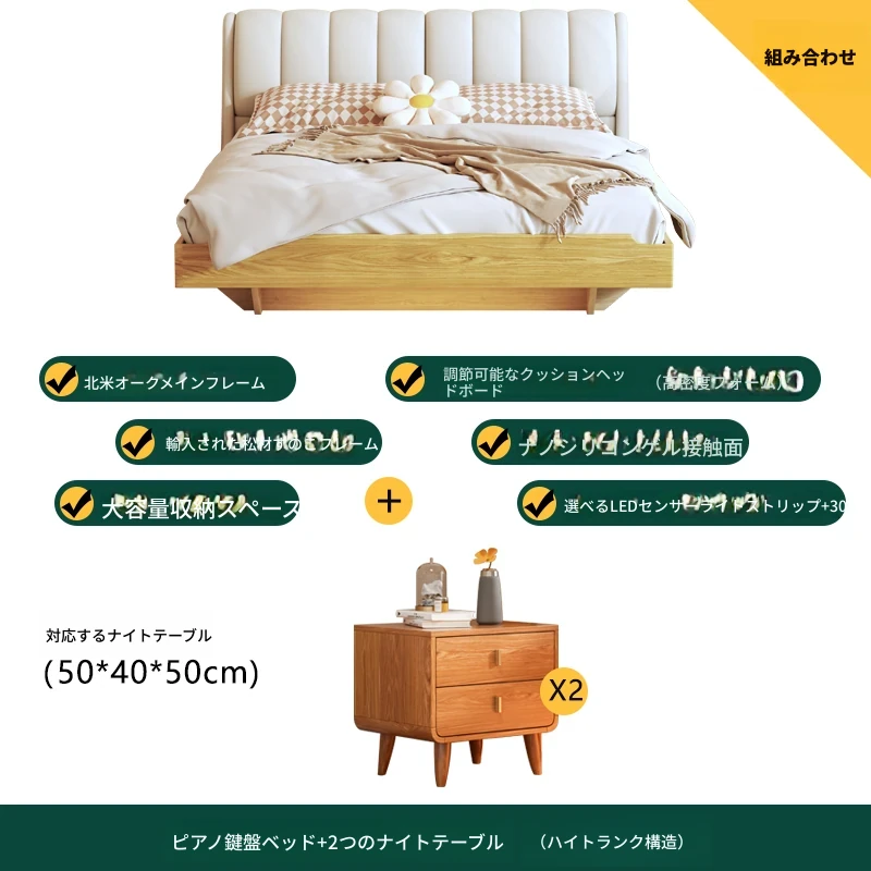 ピアノキー構造ベッド+2台ナイトスタンド(ハイブリッド構造)