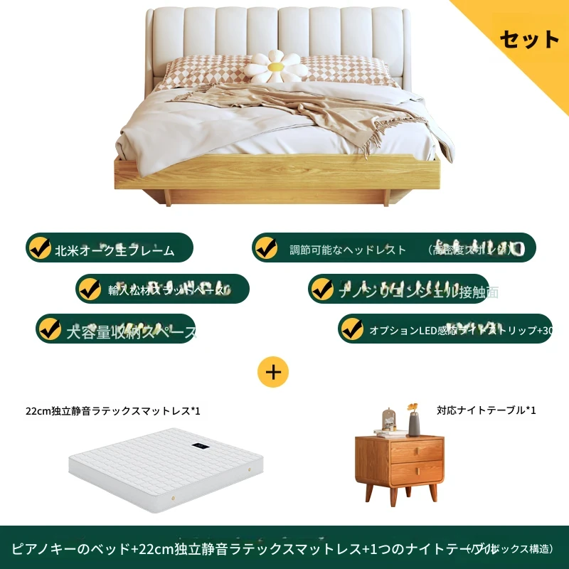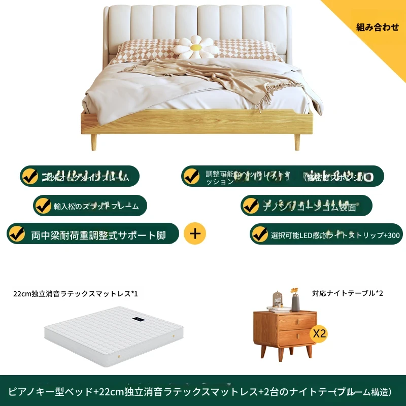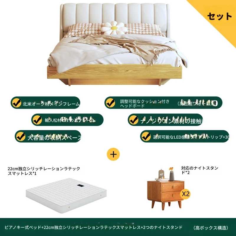 ピアノキー構造ベッド+22cm独立静音ラテックスマットレス+2台ナイトスタンド(ハイブリッド構造)