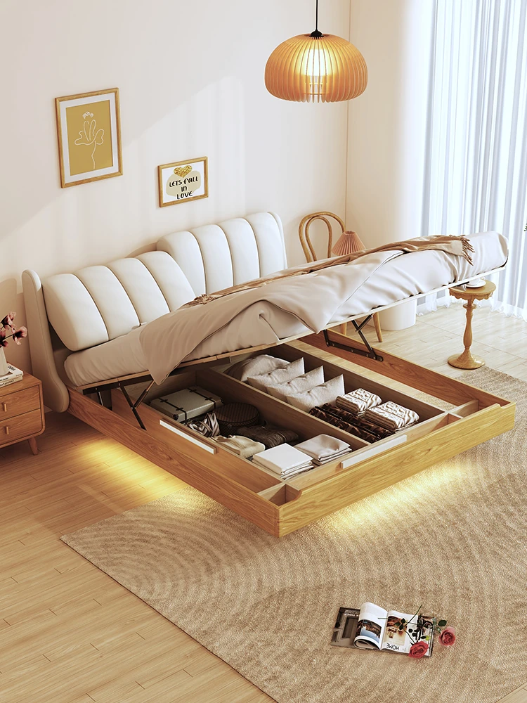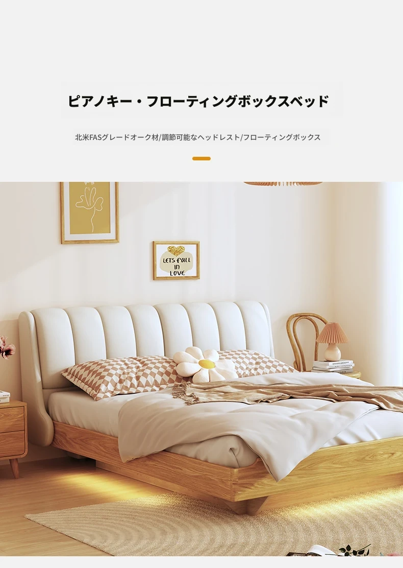 魅力の一品!ナチュラルな木目が美しい全無垢材仕様、北欧風デザインのモダンなマルチ機能付き浮遊式ベッド。主寝室にぴったりなオーク材使用、優雅で洗練された空間を提供します。