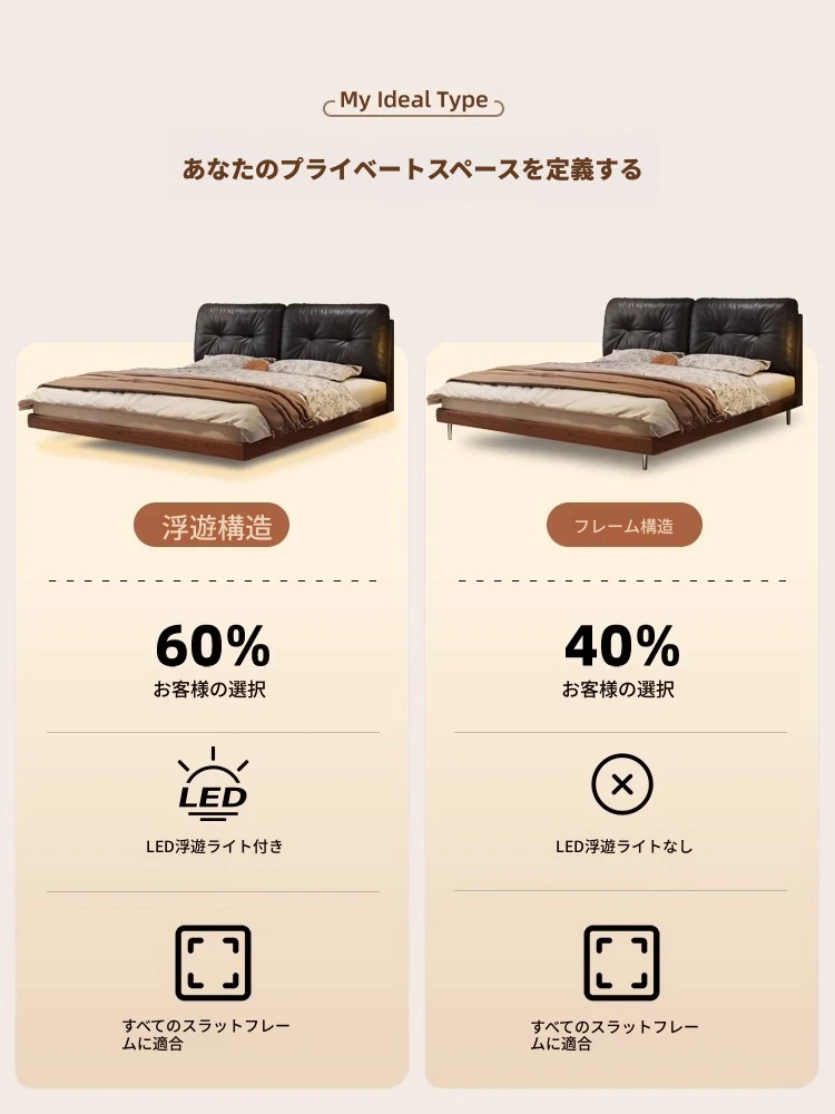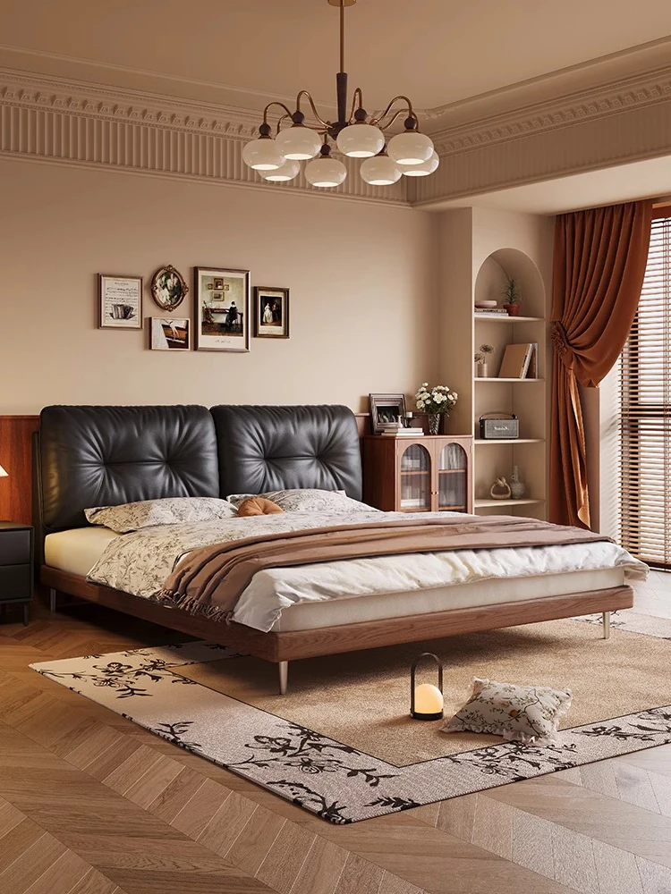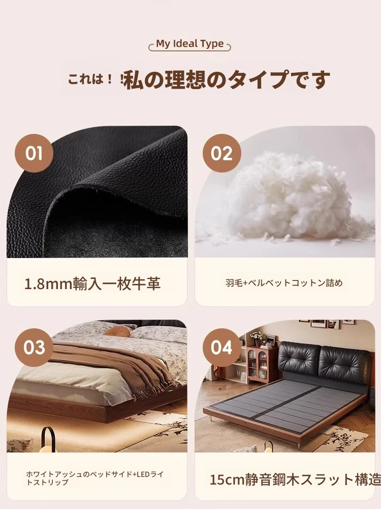 【高級感と復古風】イタリアンミニマリズム・ブラック・レザー浮遊ベッド - 主寝室におすすめ!新古典スタイルのホワイトアッシュ無垢材ベッド