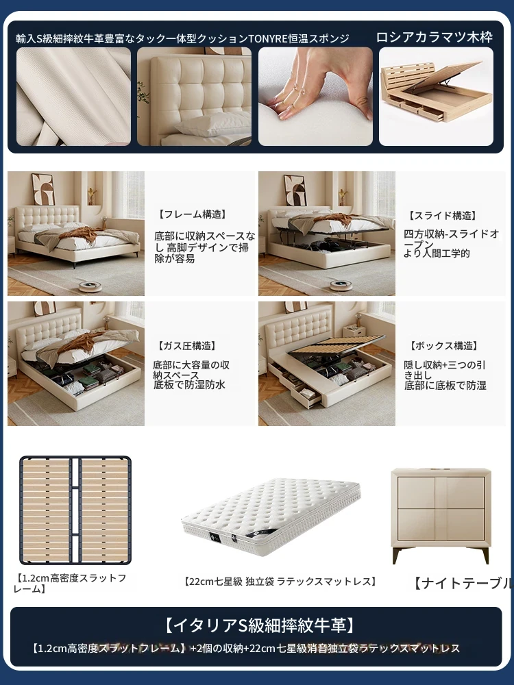 【魅力発売中】カドリークラウド本革ベッド:モダンでシンプルなデザインが特徴!収納たっぷりハイボックス仕様、クリームカラーのダブルベッドは新婚カップルに最適!