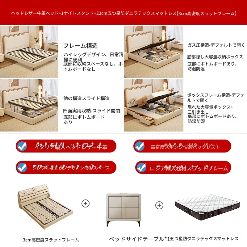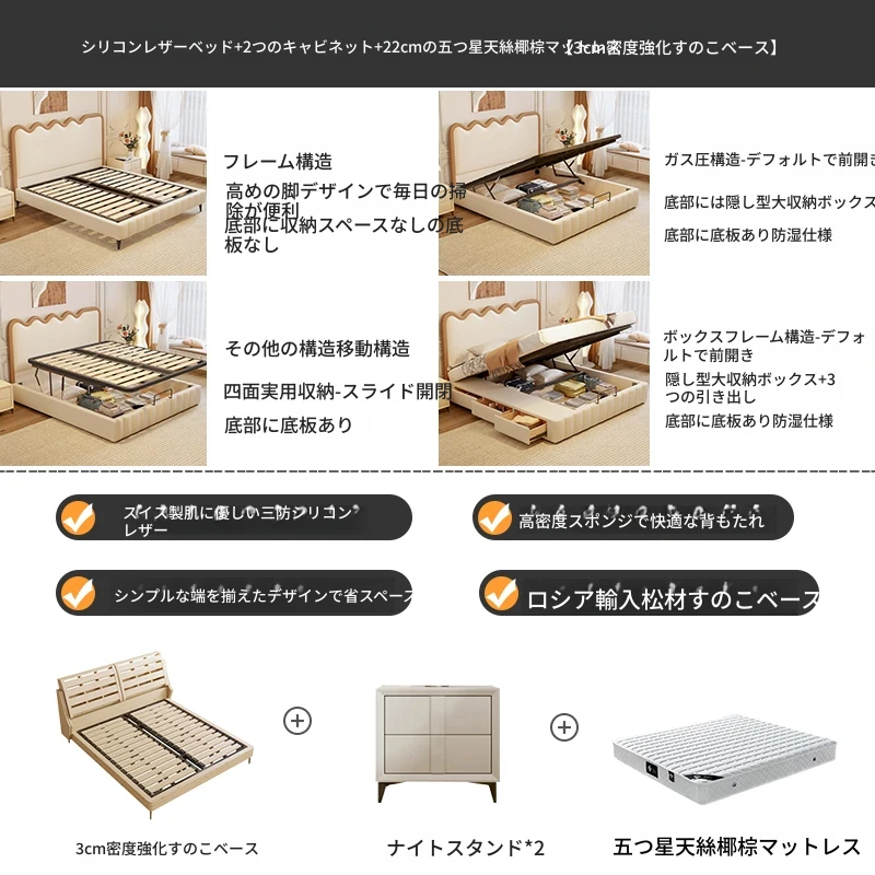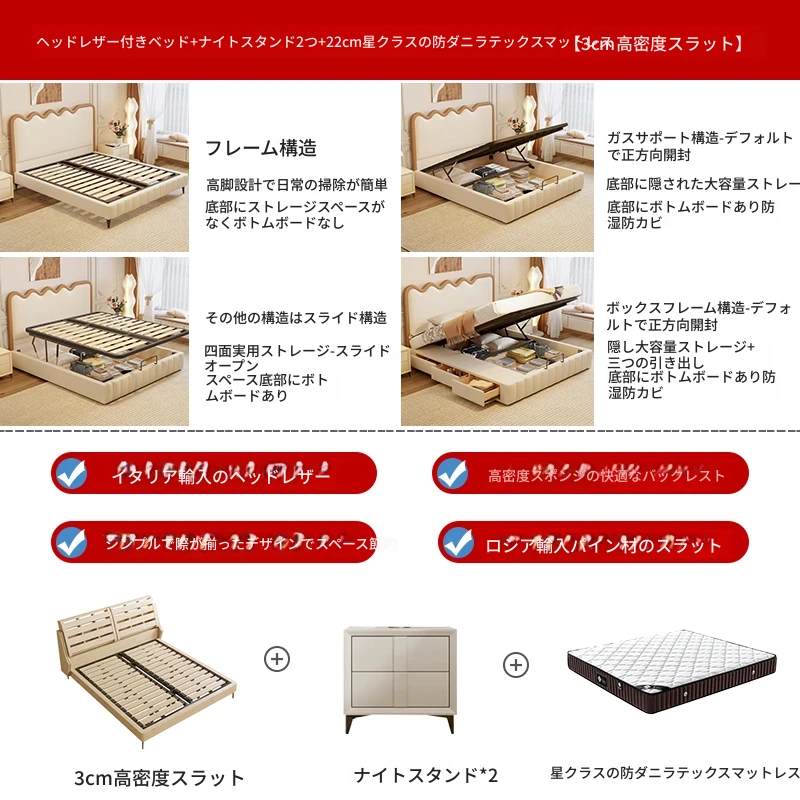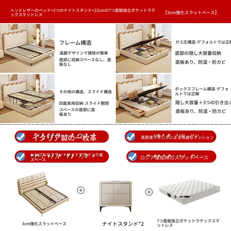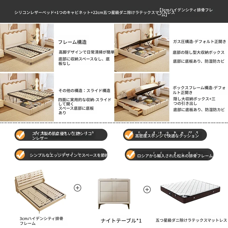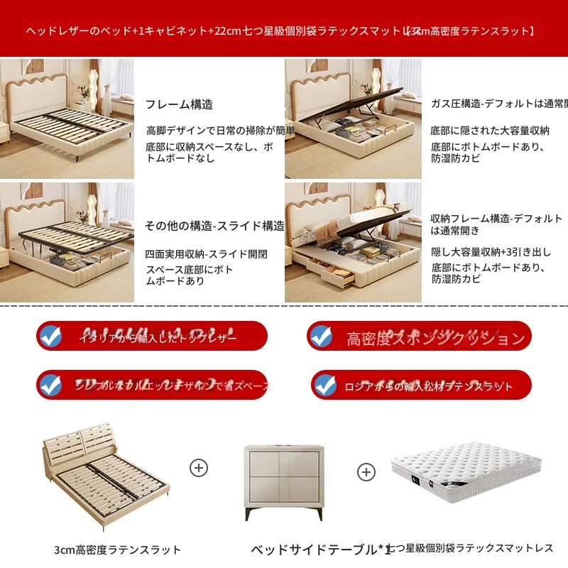 トップレザー仕上げのベッド+1キャビネット+22cm 六つ星クラスの抗菌防ダニラテックスマットレス