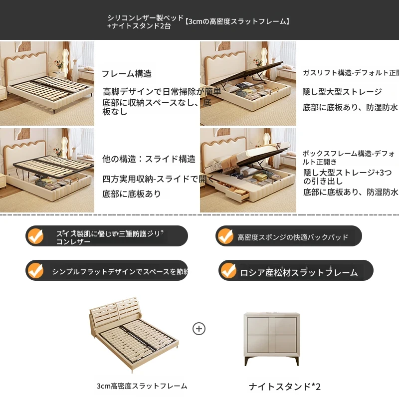 シリコンレザーベッド+2キャビネット+22cm五つ星クラスのテンセルココマットレス【3cm密集スラット】