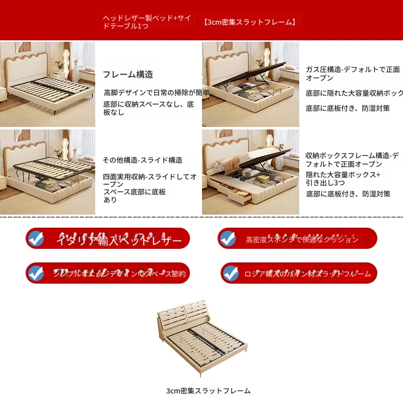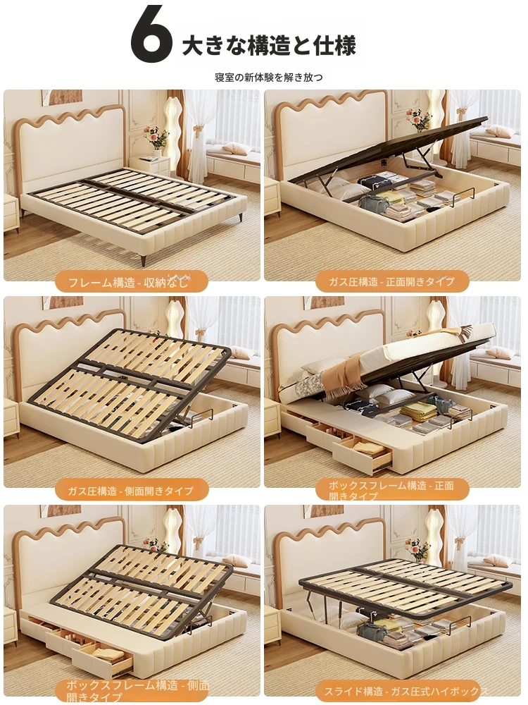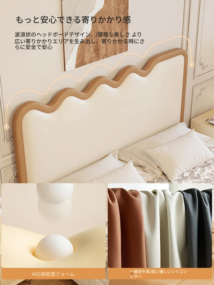 新登場!軽量かつ高級感溢れるモダンデザイン- フランス風クリームリップルウェーブ真皮収納ベッド。トレンドを先取り、寝室をスタイリッシュに飾るダブルベッド!
