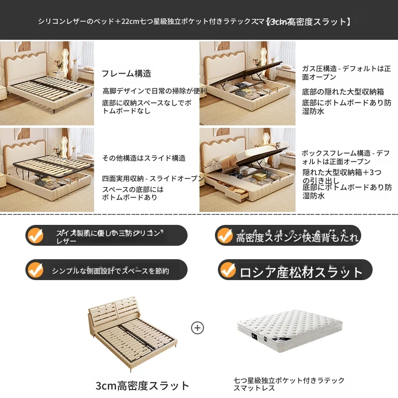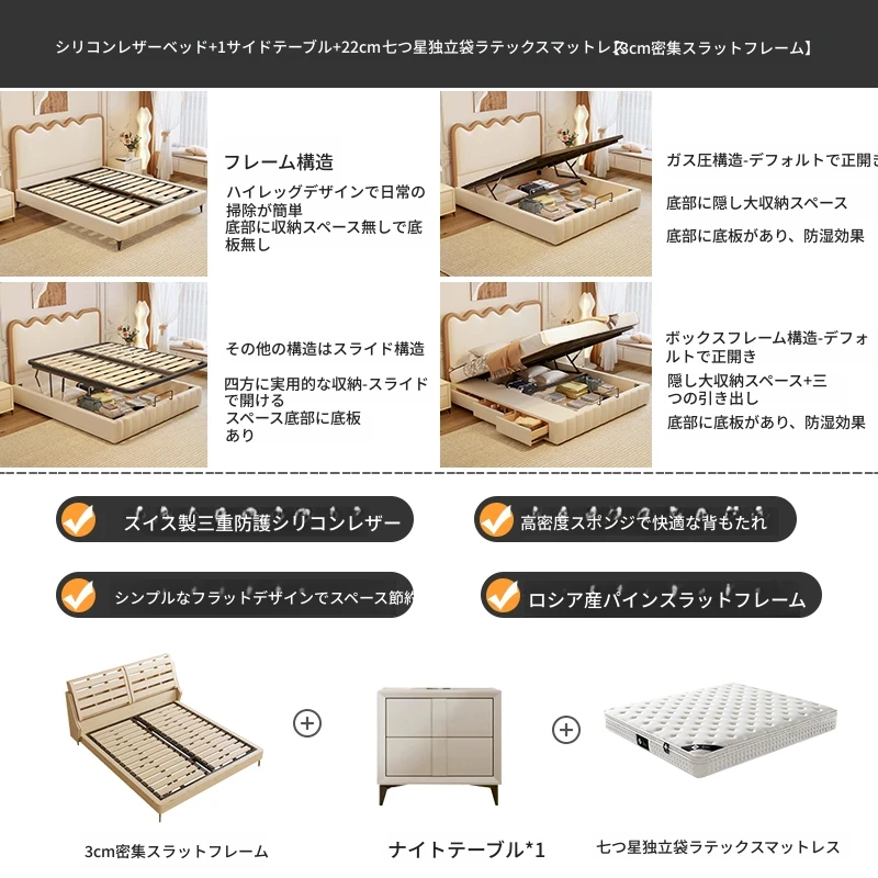 シリコンレザーベッド+1キャビネット+22cm 七つ星クラスの独立袋状ラテックスマットレス【3cm密集スラット】