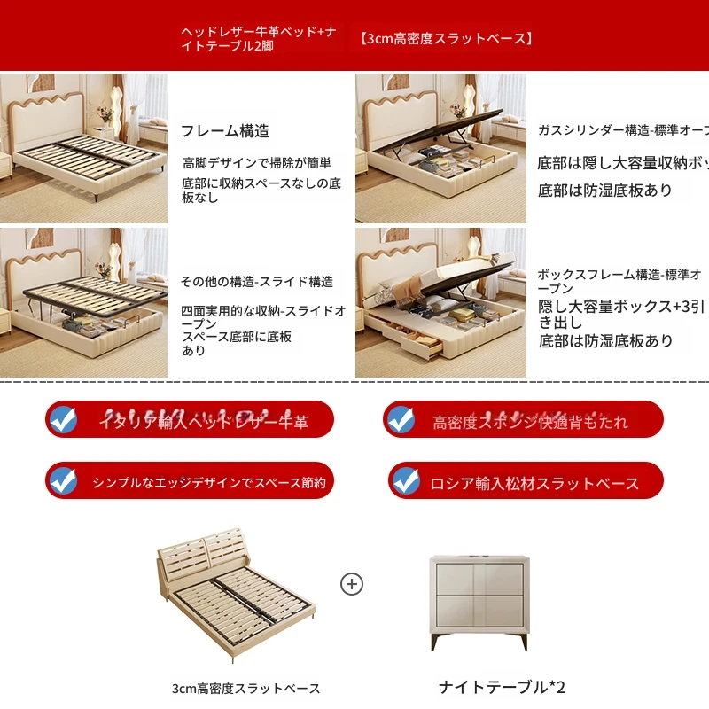 トップレザー仕上げのベッド+2キャビネット+22cm 六つ星クラスの抗菌防ダニラテックスマットレス