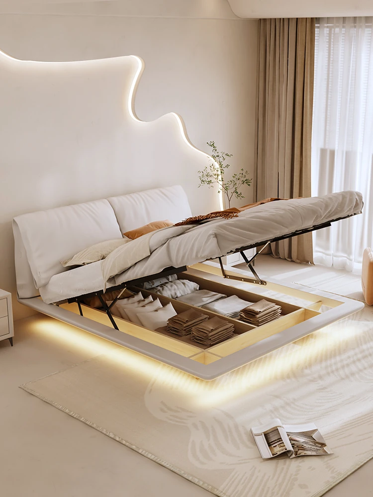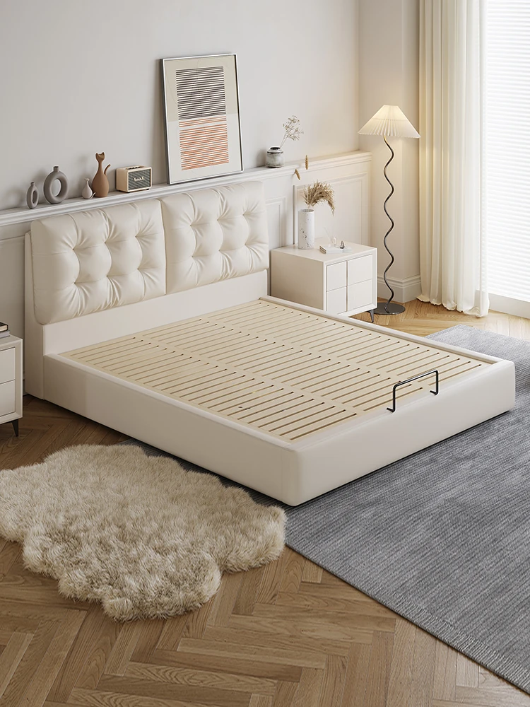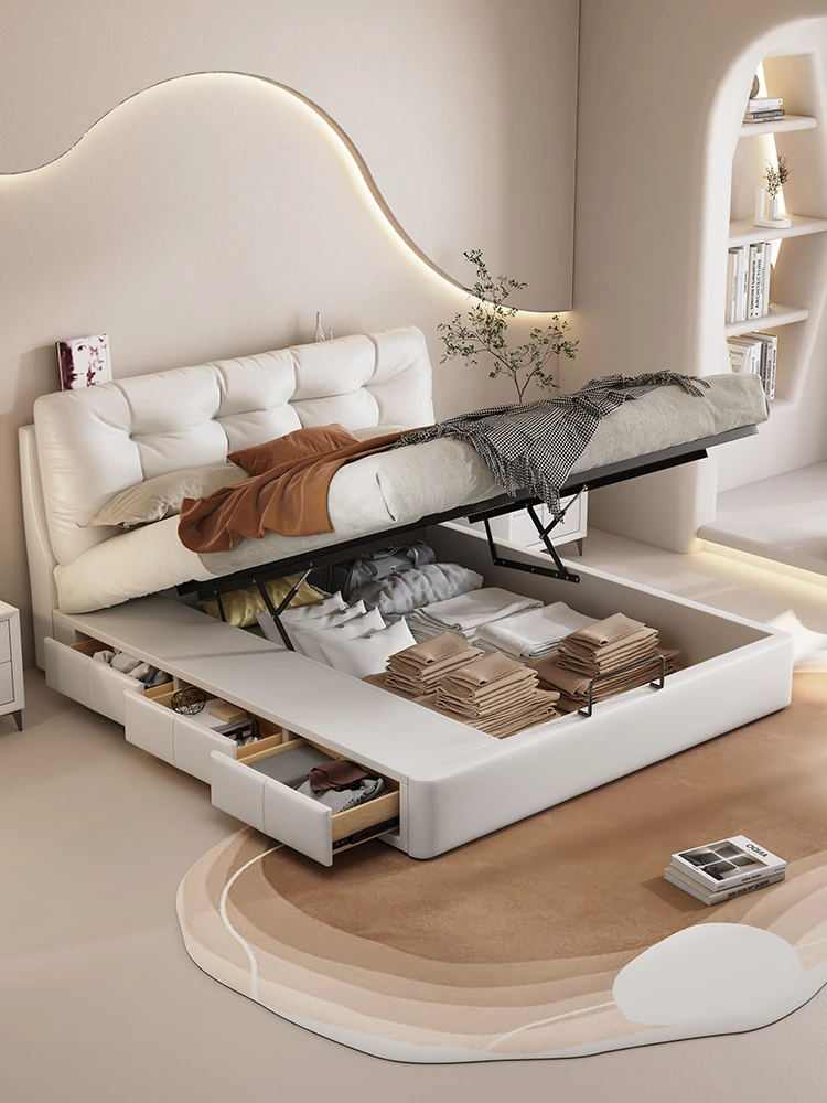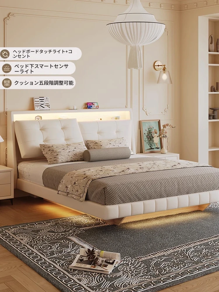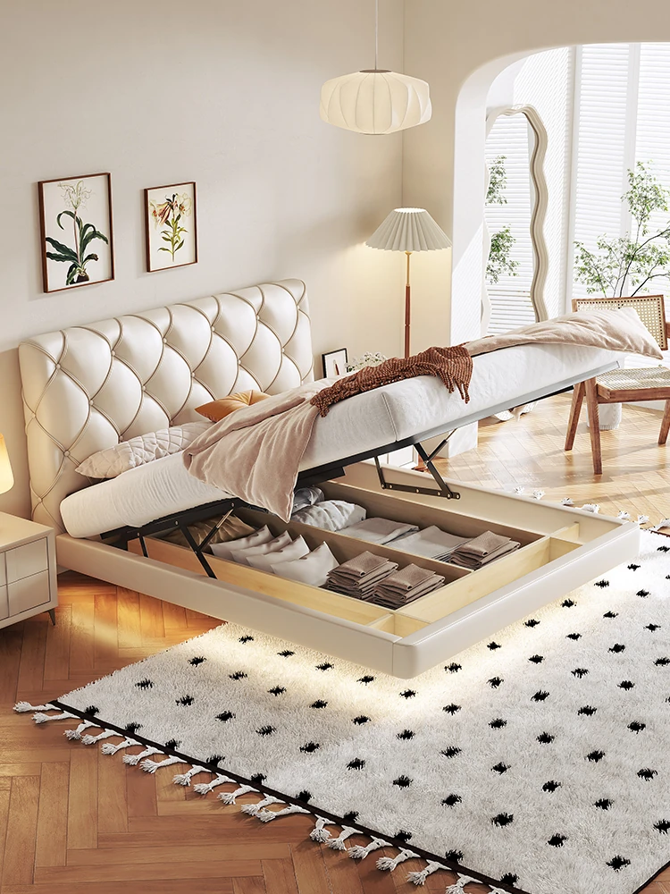 美宅生活エレガントクリーム風象耳デザインの本革ベッド 高級牛革製浮遊型主寝室ダブル収納ボックスベッド 快適な睡眠空間を演出します!