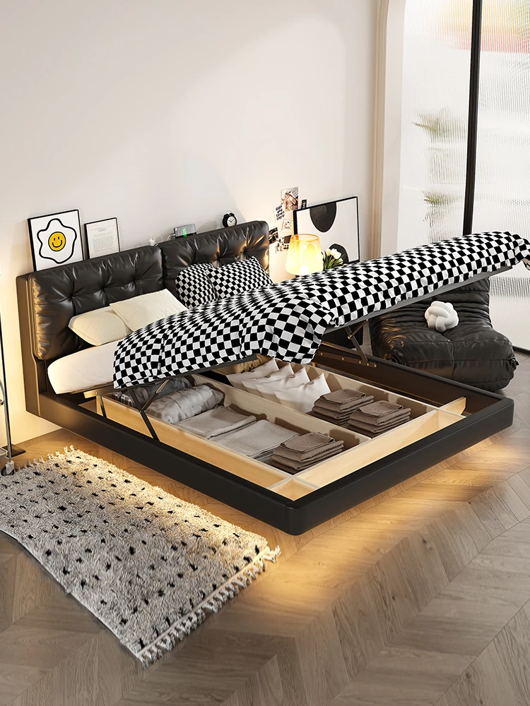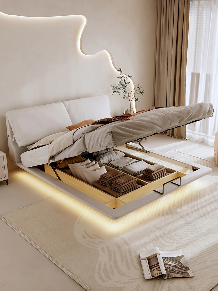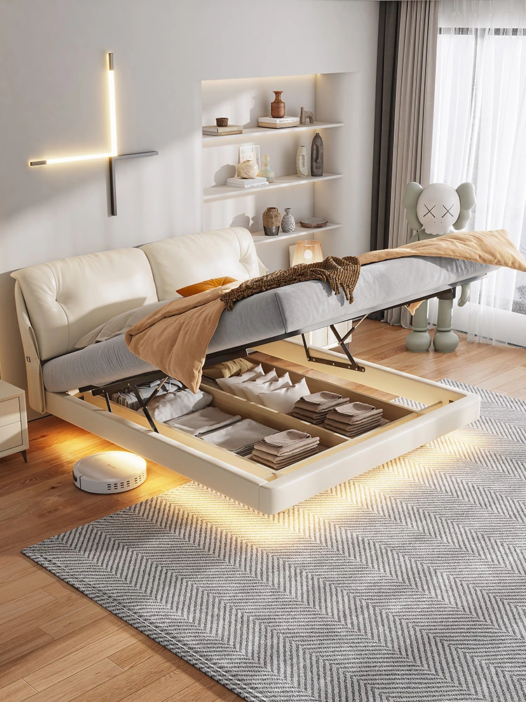イタリアンミニマリズムデザインの主寝室用本革ベッド - 現代的でシンプルな一級牛革を使用した浮遊式多機能収納ベッド