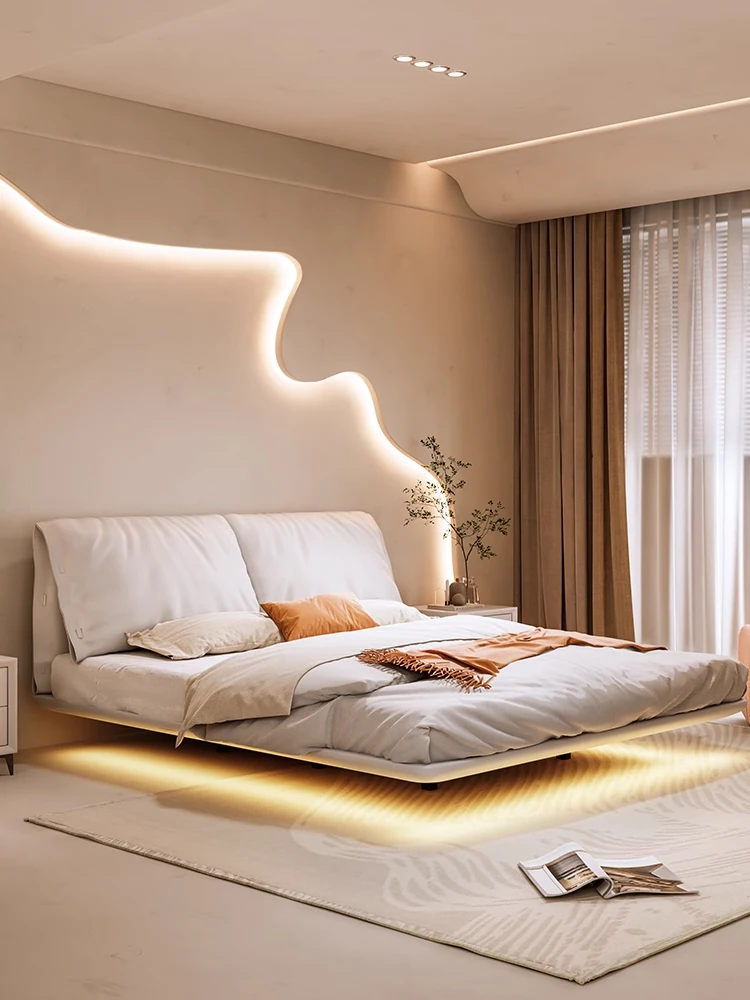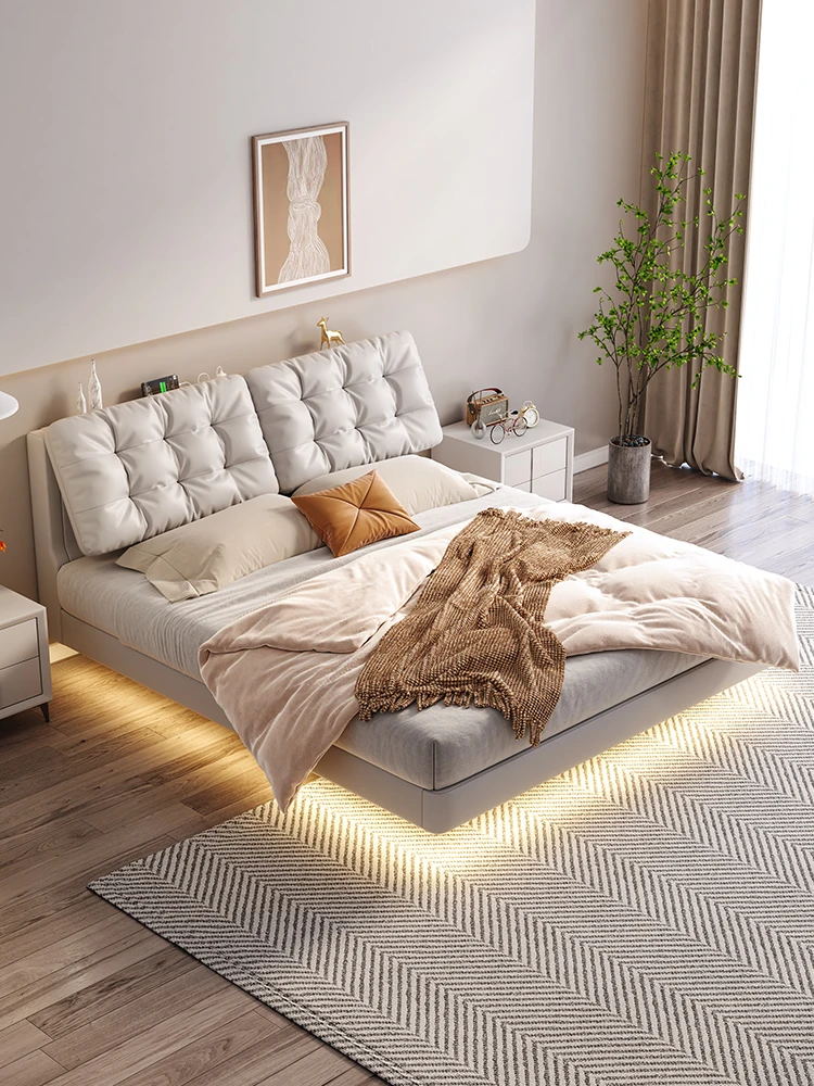 美しいライフスタイルの象耳浮遊ベッド|本革クリーム色の現代的でシンプルなデザイン|マルチファンクションのダブルベッド、主寝室にぴったり!